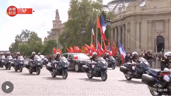 當(dāng)?shù)貢r間5月6日下午,歡迎儀式后,習(xí)近平主席和夫人彭麗媛在共和國衛(wèi)隊148名騎兵組成的禮兵馬隊和摩托車隊護衛(wèi)下,乘車前往愛麗舍宮。