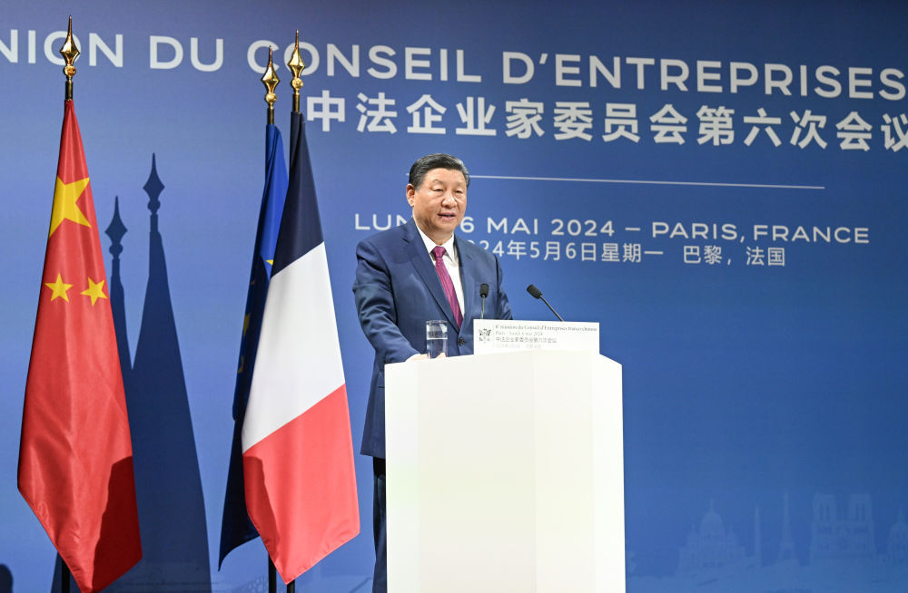 當(dāng)?shù)貢r(shí)間5月6日下午,國(guó)家主席習(xí)近平在巴黎同法國(guó)總統(tǒng)馬克龍共同出席中法企業(yè)家委員會(huì)第六次會(huì)議閉幕式,并發(fā)表題為《繼往開(kāi)來(lái),攜手開(kāi)創(chuàng)中法合作新時(shí)代》的重要致辭。兩國(guó)元首同中法企業(yè)家代表合影,隨后共同步入劇院禮堂。