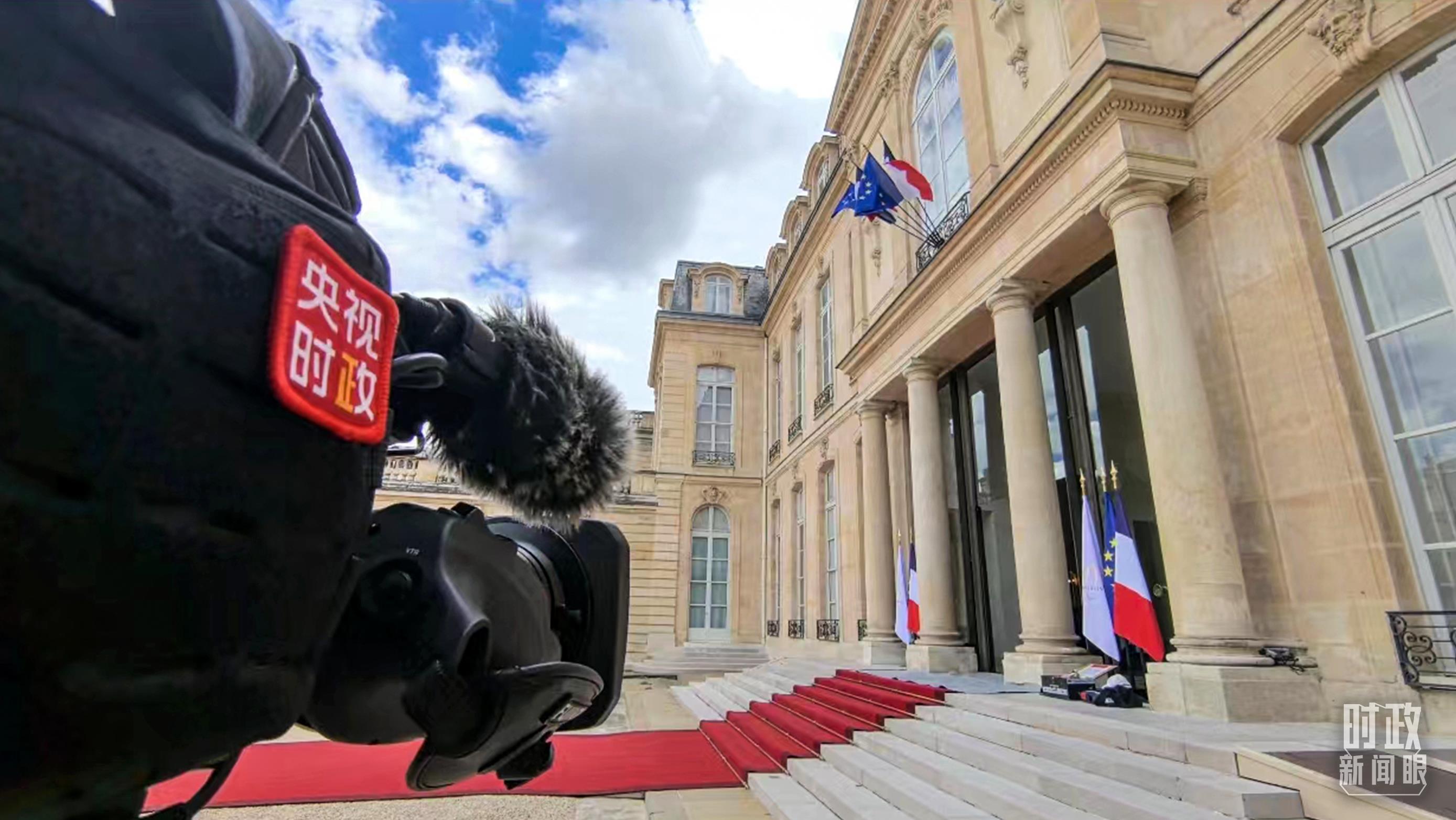 中法歐領(lǐng)導(dǎo)人三方會(huì)晤地點(diǎn)——愛麗舍宮懸掛中法兩國國旗。(總臺央視記者劉琦拍攝)