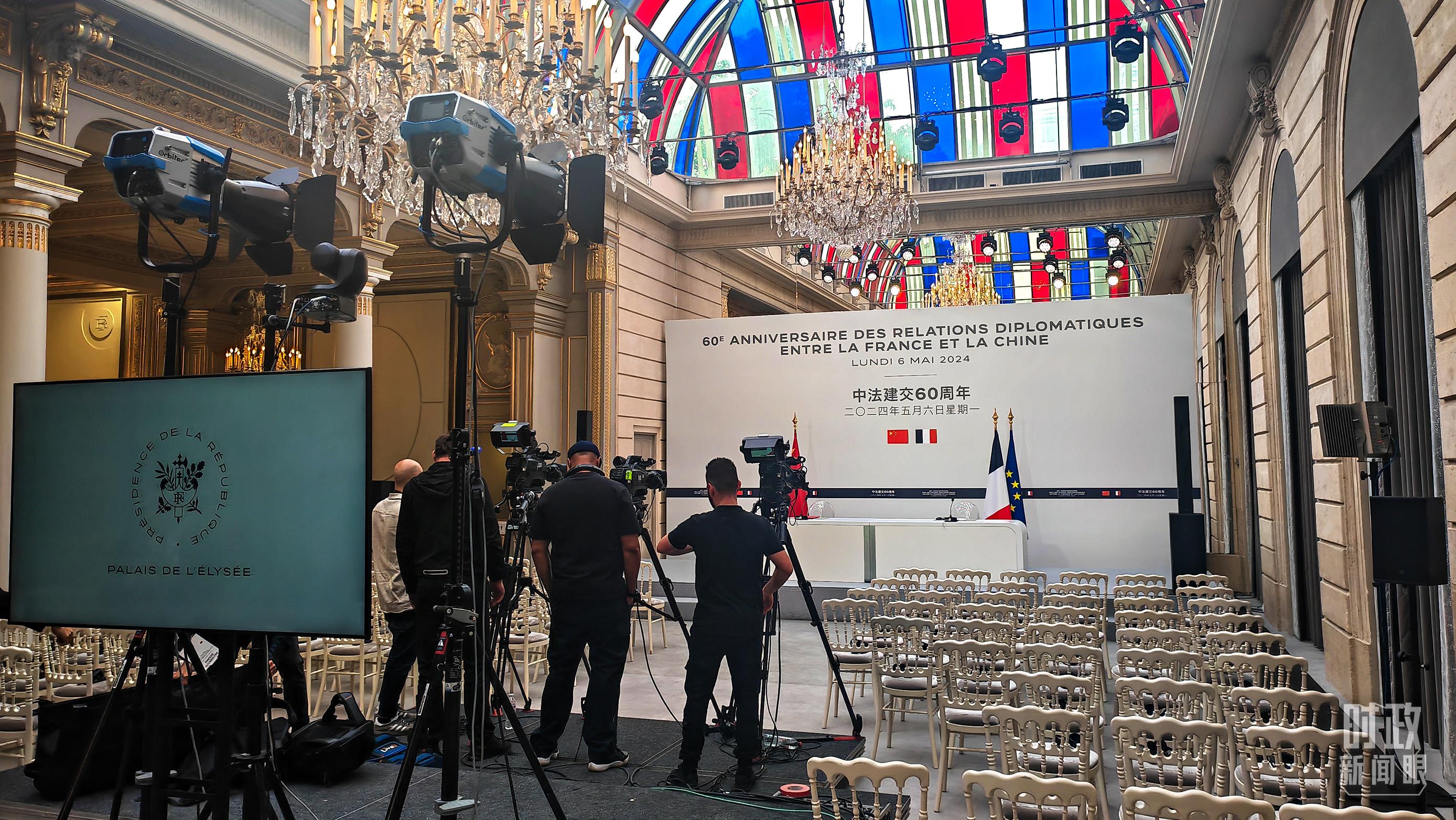 習(xí)主席在巴黎愛麗舍宮同馬克龍總統(tǒng)會(huì)談后共同會(huì)見記者,這是會(huì)見開始前的現(xiàn)場。(總臺央廣記者劉會(huì)民拍攝)