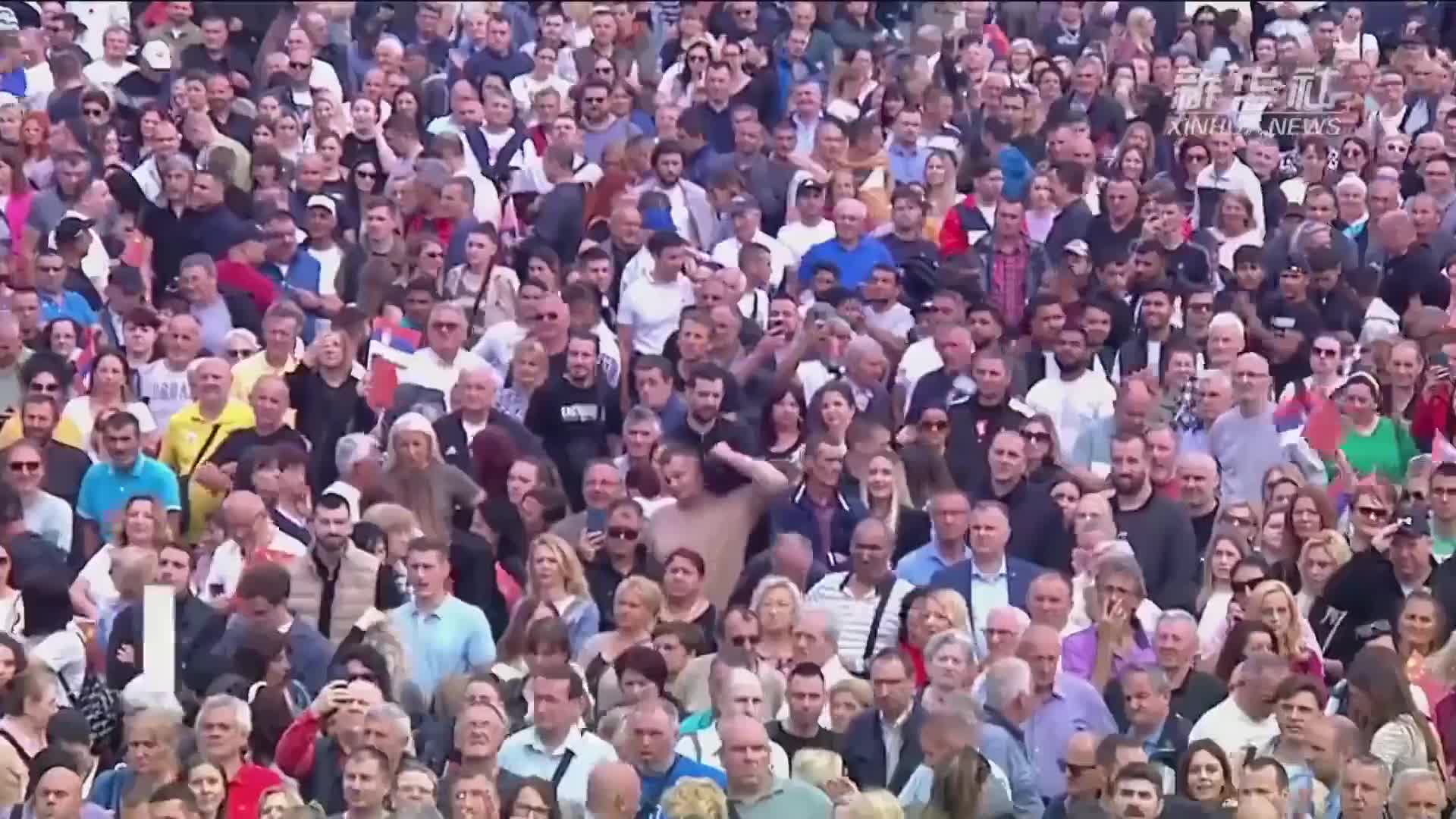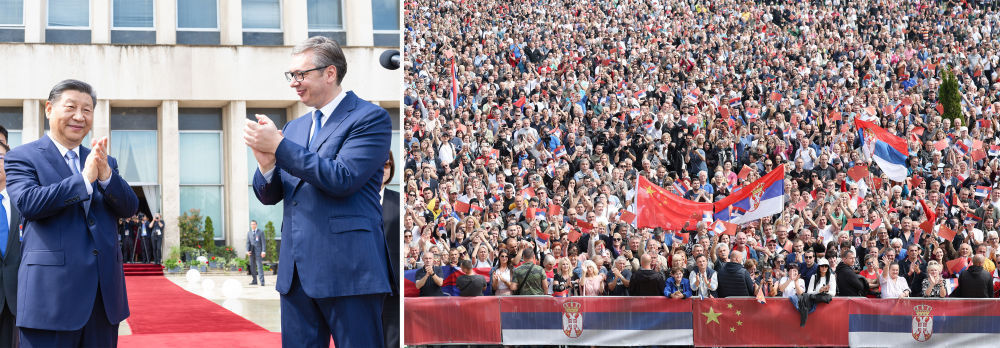當(dāng)?shù)貢r(shí)間5月8日上午,國家主席習(xí)近平在貝爾格萊德塞爾維亞大廈同塞爾維亞總統(tǒng)武契奇舉行會(huì)談。會(huì)談前,武契奇陪同習(xí)近平來到政府大廈平臺(左圖)。大廈廣場上,一萬五千名塞爾維亞民眾揮舞中塞兩國國旗,對習(xí)近平表示最熱烈的歡迎(右圖)。