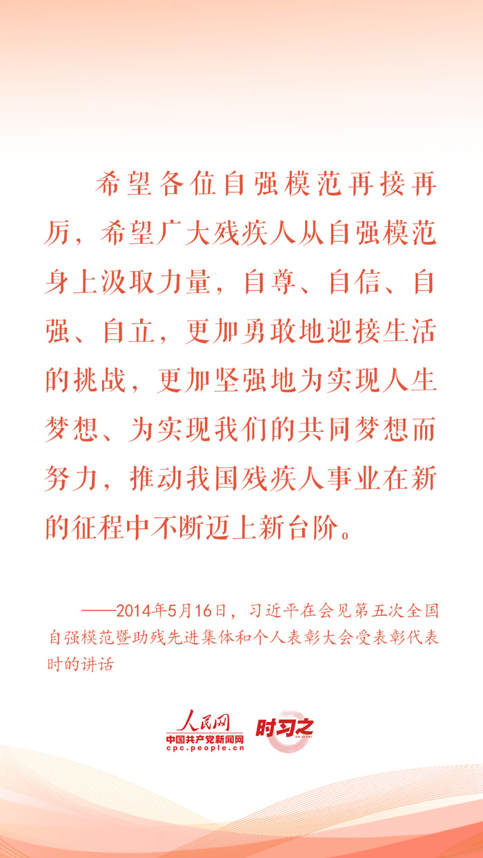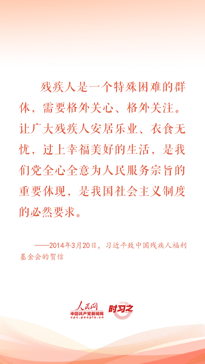 2024年5月19日是第三十四次全國(guó)助殘日。對(duì)于殘疾人這個(gè)特殊群體,習(xí)近平總書(shū)記始終格外關(guān)心、格外關(guān)注,在不同場(chǎng)合頻頻為他們加油鼓勁,勉勵(lì)他們活出精彩的人生。