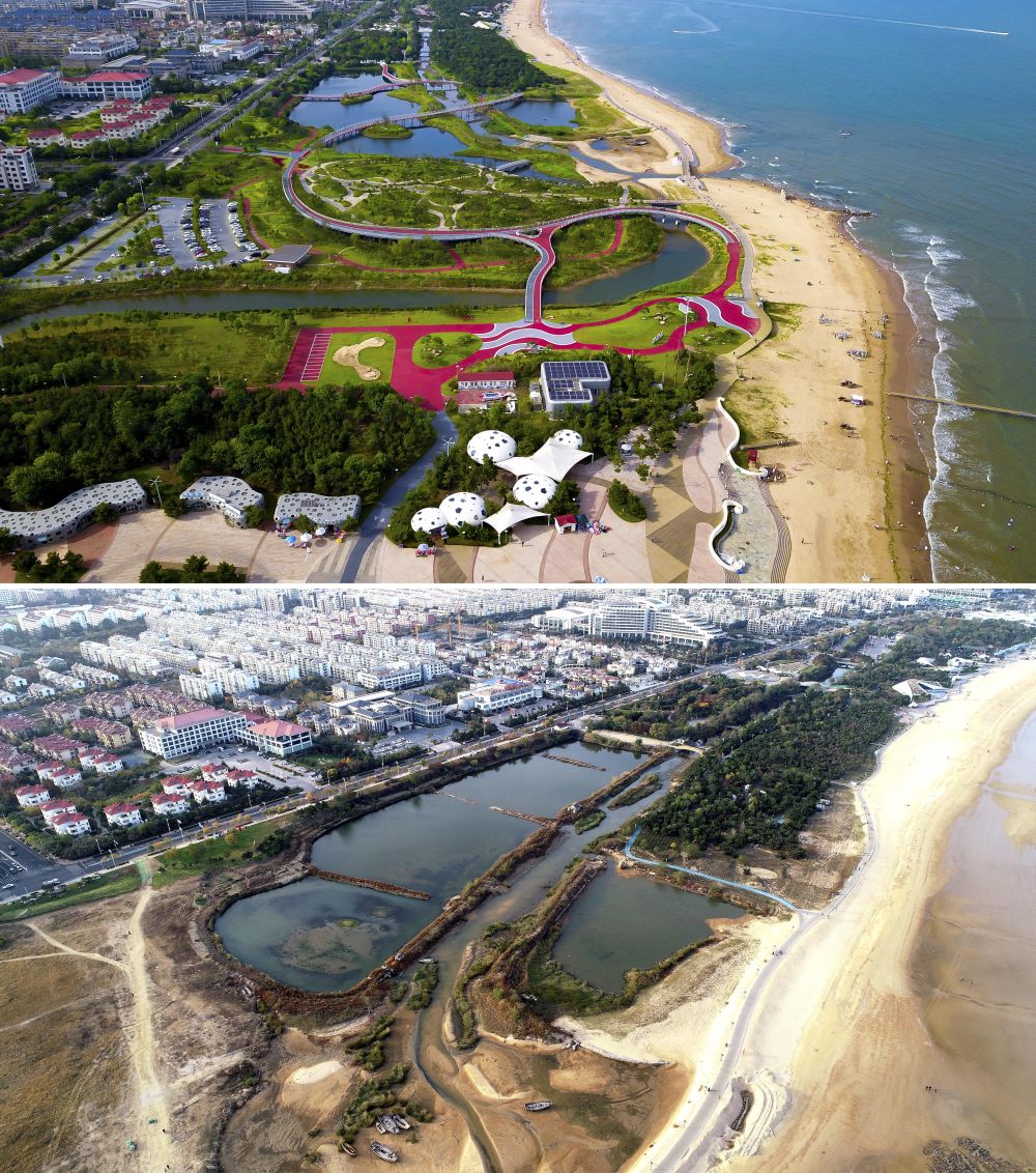 這是一張拼版照片,上圖為2021年拍攝的生態(tài)修復(fù)完成后的山東日照市陽光海岸綠道,該綠道長28公里(無人機(jī)照片);下圖為2019年11月拍攝的日照市陽光海岸綠道未經(jīng)生態(tài)修復(fù)時的樣子。新華社記者 郭緒雷 攝