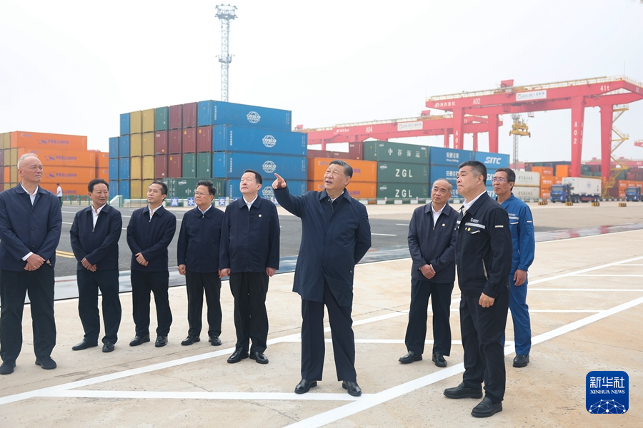 5月22日至24日,中共中央總書記、國(guó)家主席、中央軍委主席習(xí)近平在山東考察。這是22日下午,習(xí)近平在日照港親切慰問港口科技工作者、運(yùn)營(yíng)人員、航運(yùn)人員。新華社記者 鞠鵬 攝
