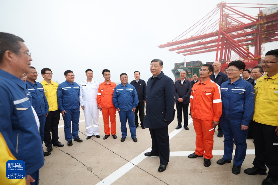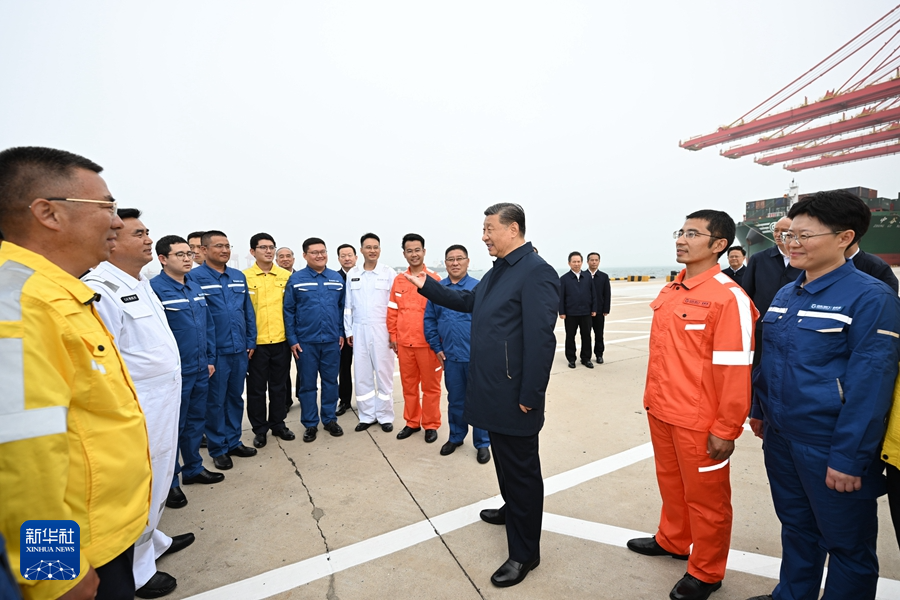 5月22日至24日,中共中央總書記、國(guó)家主席、中央軍委主席習(xí)近平在山東考察。這是22日下午,習(xí)近平在日照港親切慰問港口科技工作者、運(yùn)營(yíng)人員、航運(yùn)人員。新華社記者 謝環(huán)馳 攝