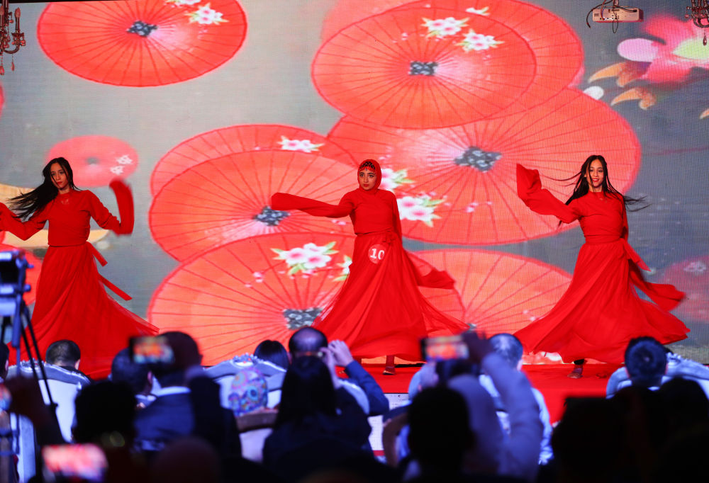 5月12日,參賽選手在埃及開羅舉辦的第23屆“漢語橋”世界大學(xué)生中文比賽埃及大區(qū)賽上表演才藝。