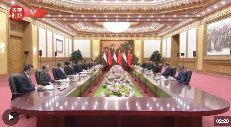 習(xí)近平指出,歡迎總統(tǒng)先生訪華并出席中阿合作論壇第十屆部長級(jí)會(huì)議開幕式。借此機(jī)會(huì),我對你再次連任總統(tǒng)表示誠摯祝賀。今年是中埃建立全面戰(zhàn)略伙伴關(guān)系10周年。10年來,我同總統(tǒng)先生先后11次會(huì)面,共同引領(lǐng)雙邊關(guān)系蓬勃發(fā)展。中埃關(guān)系已經(jīng)發(fā)展成為中國同阿拉伯、非洲、伊斯蘭和發(fā)展中國家團(tuán)結(jié)協(xié)作、互利共贏的生動(dòng)寫照。