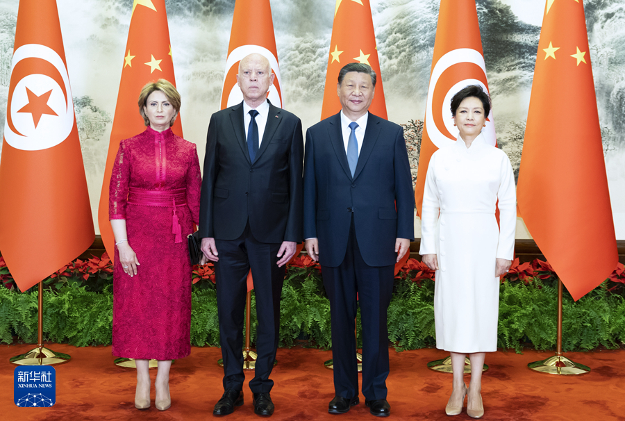 5月31日上午,國(guó)家主席習(xí)近平在北京人民大會(huì)堂同來(lái)華國(guó)事訪問(wèn)并出席中國(guó)-阿拉伯國(guó)家合作論壇第十屆部長(zhǎng)級(jí)會(huì)議開幕式的突尼斯總統(tǒng)賽義德舉行會(huì)談。這是會(huì)談前,習(xí)近平和夫人彭麗媛同賽義德和夫人伊什拉芙合影。新華社記者 黃敬文 攝
