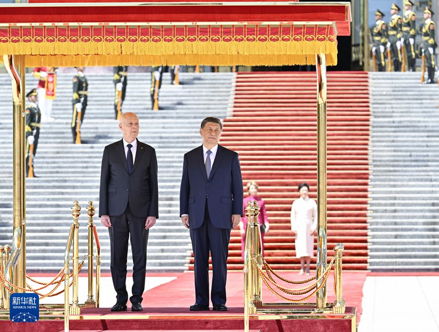 5月31日上午,國(guó)家主席習(xí)近平在北京人民大會(huì)堂同來(lái)華國(guó)事訪問(wèn)并出席中國(guó)-阿拉伯國(guó)家合作論壇第十屆部長(zhǎng)級(jí)會(huì)議開幕式的突尼斯總統(tǒng)賽義德舉行會(huì)談。這是會(huì)談前,習(xí)近平在人民大會(huì)堂東門外廣場(chǎng)為賽義德舉行歡迎儀式。新華社記者 翟健嵐 攝