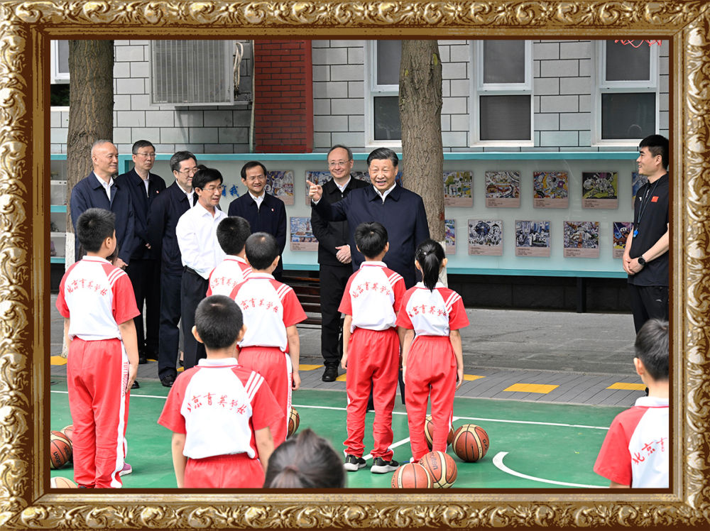 2023年5月31日上午,習(xí)近平總書記來到北京育英學(xué)??赐繂枎熒诨@球場(chǎng)同正在上體育課的小學(xué)生們親切交流。習(xí)近平親切地說:“現(xiàn)在生活條件好了,孩子們不是要吃得胖胖的,而是要長得壯壯的、練得棒棒的?!?/strong>