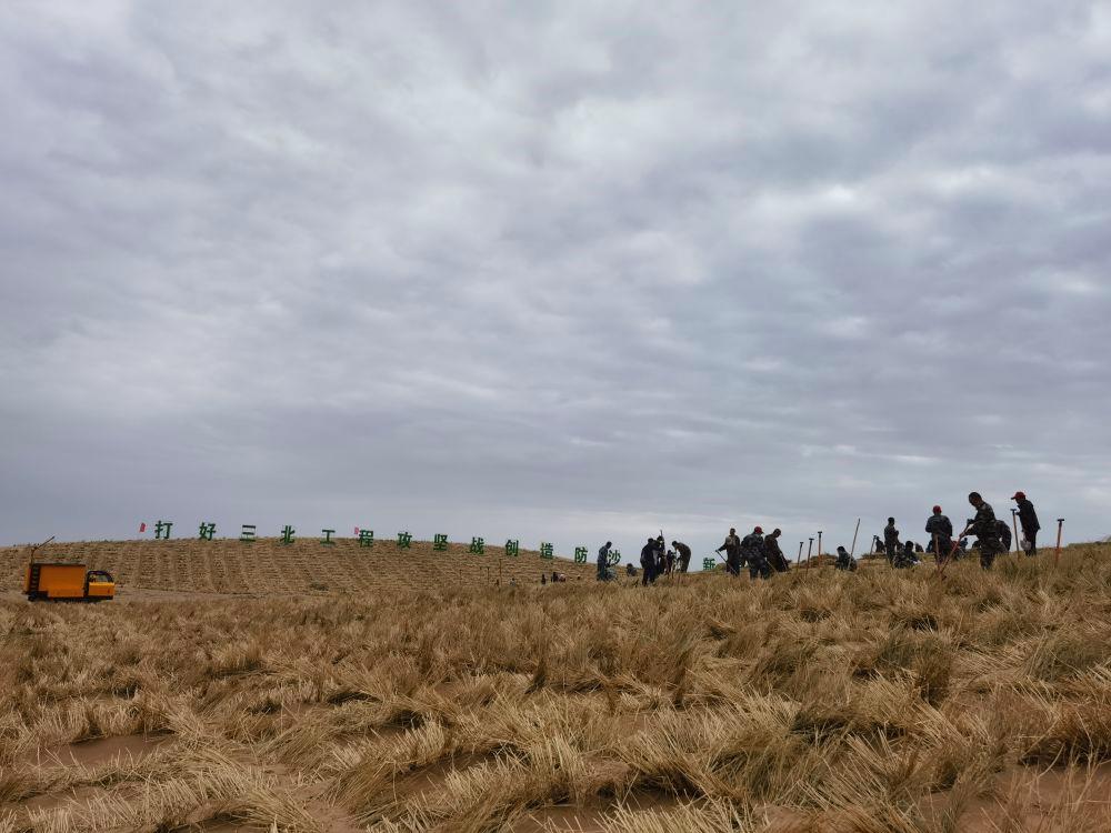 甘肅民勤縣的西大河小井子區(qū)域,草網(wǎng)格狀雙眉式沙障、稻草集束直立式沙障、尼龍網(wǎng)沙障等,間隔多行交錯(cuò)排列。研究員們逐一測量沙障寬度、高度后,按當(dāng)?shù)厮Y源等條件,栽下梭梭、毛條、沙拐棗等樹種……