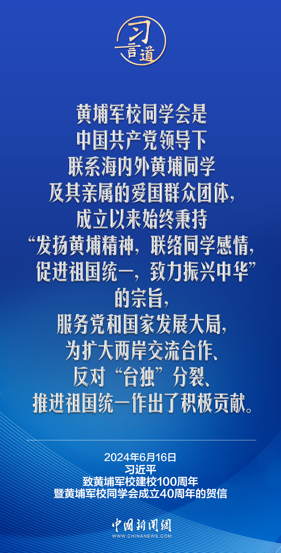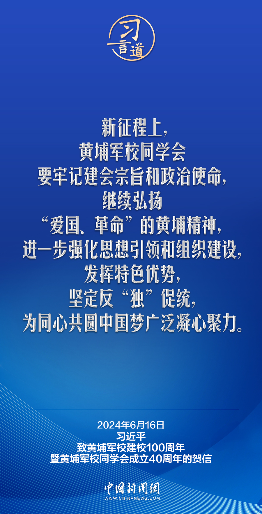 在黃埔軍校建校100周年暨黃埔軍校同學(xué)會(huì)成立40周年之際,中共中央總書記、國家主席、中央軍委主席習(xí)近平發(fā)來賀信,代表中共中央向黃埔軍校同學(xué)會(huì)表示熱烈祝賀,向廣大海內(nèi)外黃埔同學(xué)及其親屬致以誠摯問候。習(xí)近平指出——