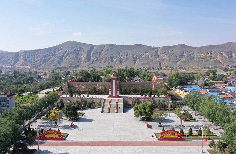 這是位于寧夏固原市西吉縣的將臺(tái)堡紅軍長征會(huì)師紀(jì)念園(2021年10月18日攝,無人機(jī)照片)。新華社記者 盧鷹 攝