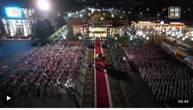 1500多名身著民族盛裝的塔吉克斯坦青年表演富有濃郁特色的中塔歌舞,揮舞中塔兩國國旗,表達對中國最尊貴客人的熱烈歡迎。