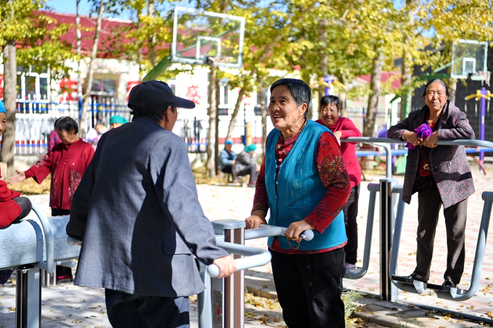 居住在河北省康保縣土城子鎮(zhèn)互助幸福院的老人們?cè)谠鹤永镄蓍e(2023年10月14日攝)。新華社記者 牟宇 攝