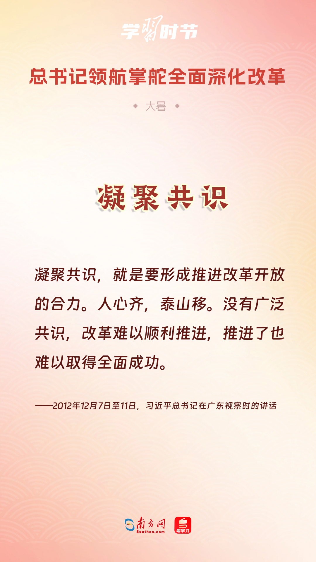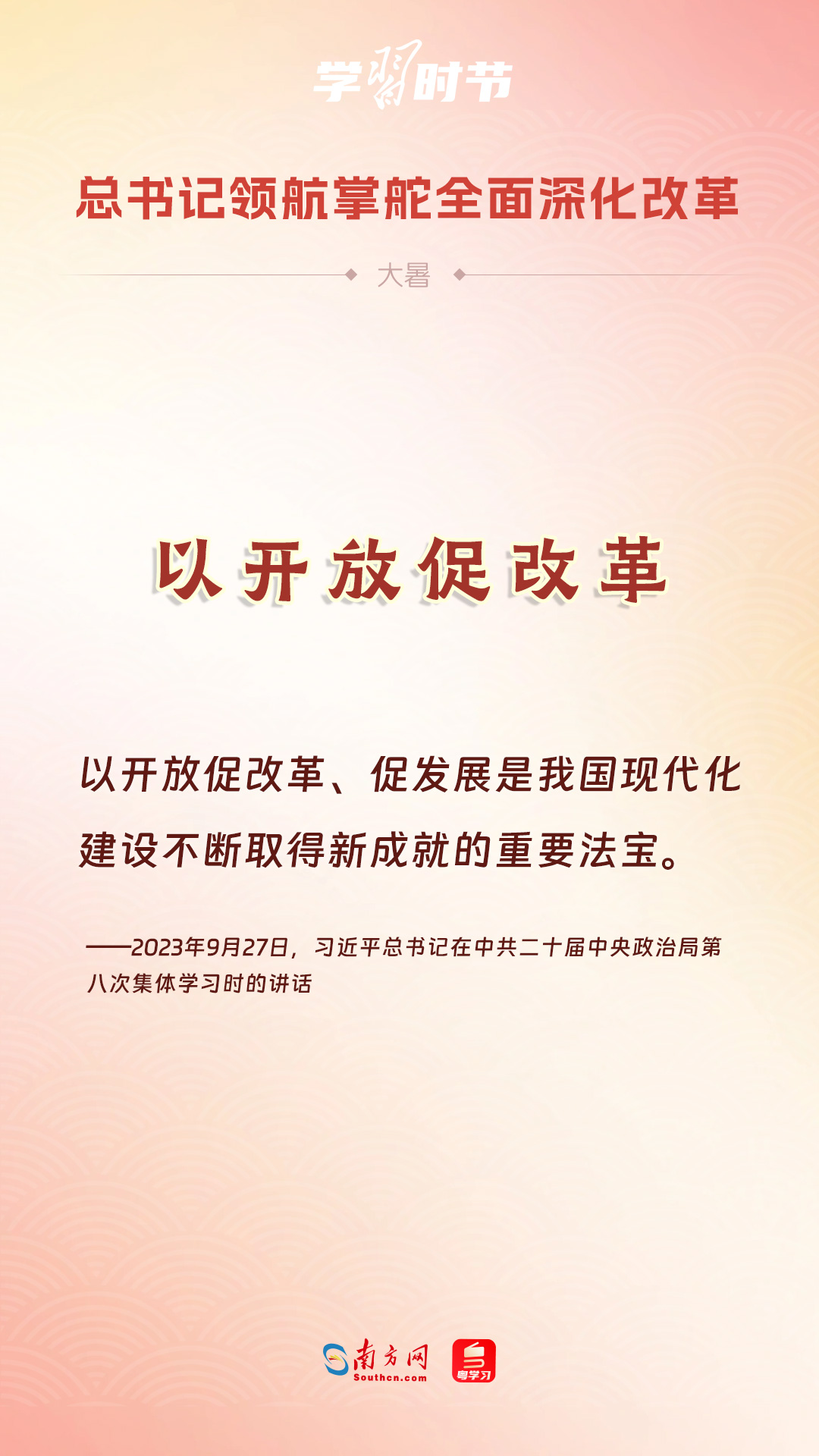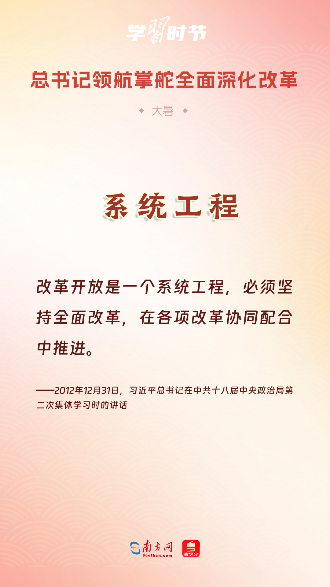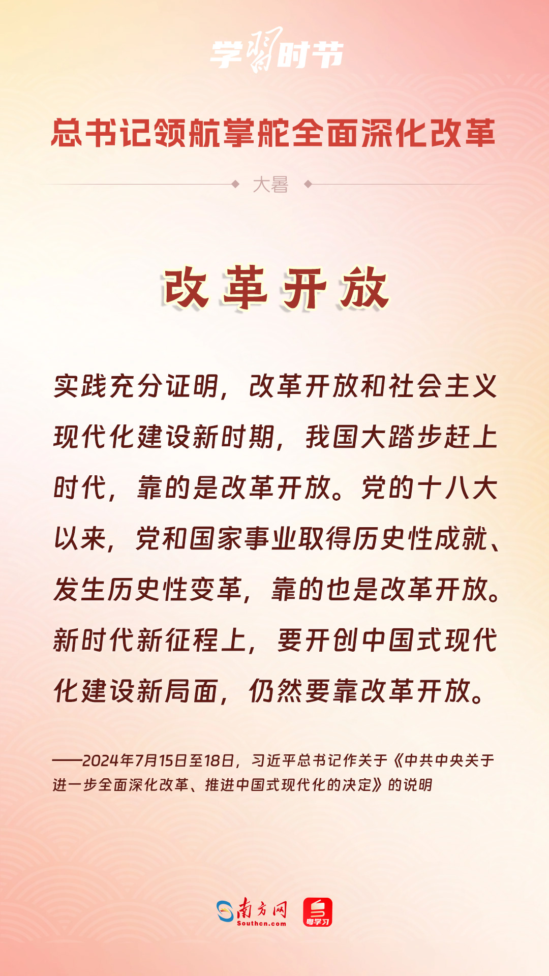 黨的十八大以來(lái),習(xí)近平總書記親自領(lǐng)導(dǎo)、親自部署、親自推動(dòng)全面深化改革工作,推動(dòng)全面深化改革事業(yè)在攻堅(jiān)克難中不斷邁上新臺(tái)階、取得新勝利。在驕陽(yáng)似火的大暑時(shí)節(jié),通過(guò)一組海報(bào),讓我們共同學(xué)習(xí)習(xí)近平總書記關(guān)于“全面深化改革”的重要論述。