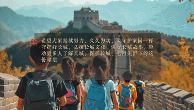 希望大家接續(xù)努力、久久為功,像守護家園一樣守護好長城,弘揚長城文化,講好長城故事,帶動更多人了解長城、保護長城,把祖先留下的這份珍貴財富世世代代傳下去,為建設(shè)社會主義文化強國、推進中國式現(xiàn)代化貢獻力量。