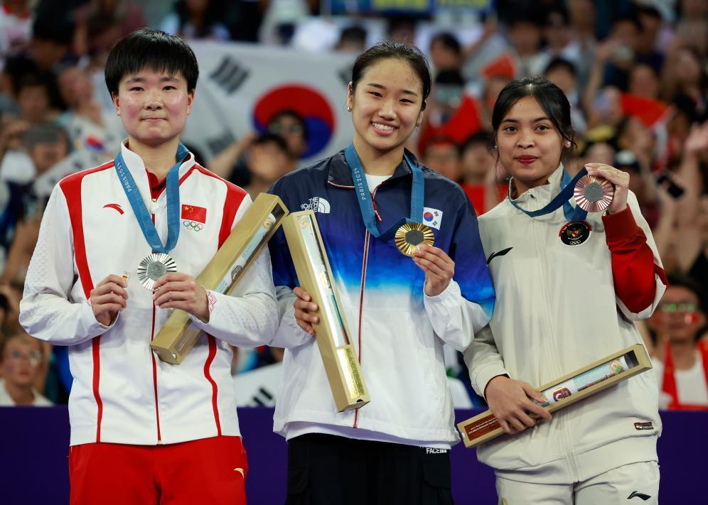 8月5日,羽毛球女單冠軍韓國(guó)選手安洗瑩(中)、亞軍中國(guó)選手何冰嬌(左)、季軍印度尼西亞選手瑪麗斯卡在頒獎(jiǎng)儀式上。
