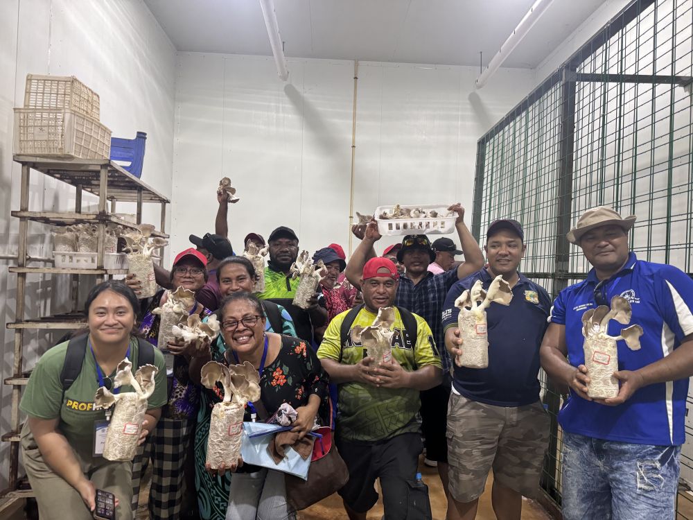 2月28日,在斐濟楠迪,培訓(xùn)班學(xué)員手捧菌草菇合影。新華社發(fā)(中國援斐濟菌草技術(shù)示范中心供圖)