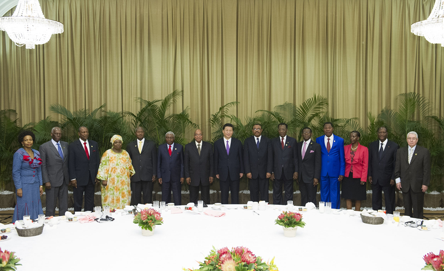 圖為2013年3月28日,國家主席習近平在南非德班同非洲國家領(lǐng)導人早餐會合影。新華社發(fā)