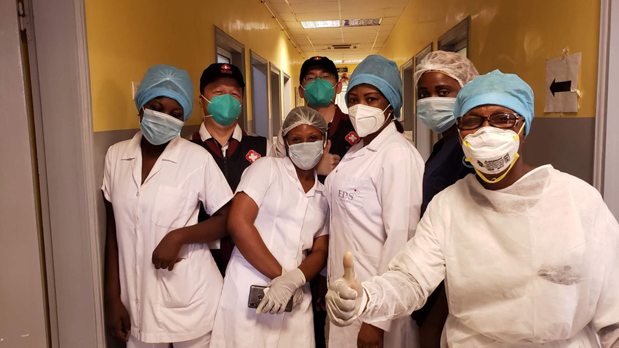 2020年5月26日,中國抗疫醫(yī)療專家組在剛果(布)首都布拉柴維爾指導新冠肺炎病房建設(shè)時,與當?shù)匾痪€醫(yī)務(wù)人員合影。新華社發(fā)