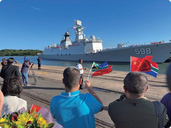 △聯(lián)合演習(xí)開(kāi)始前一天,中國(guó)海軍日照艦抵達(dá)南非理查茲灣港口,受到歡迎