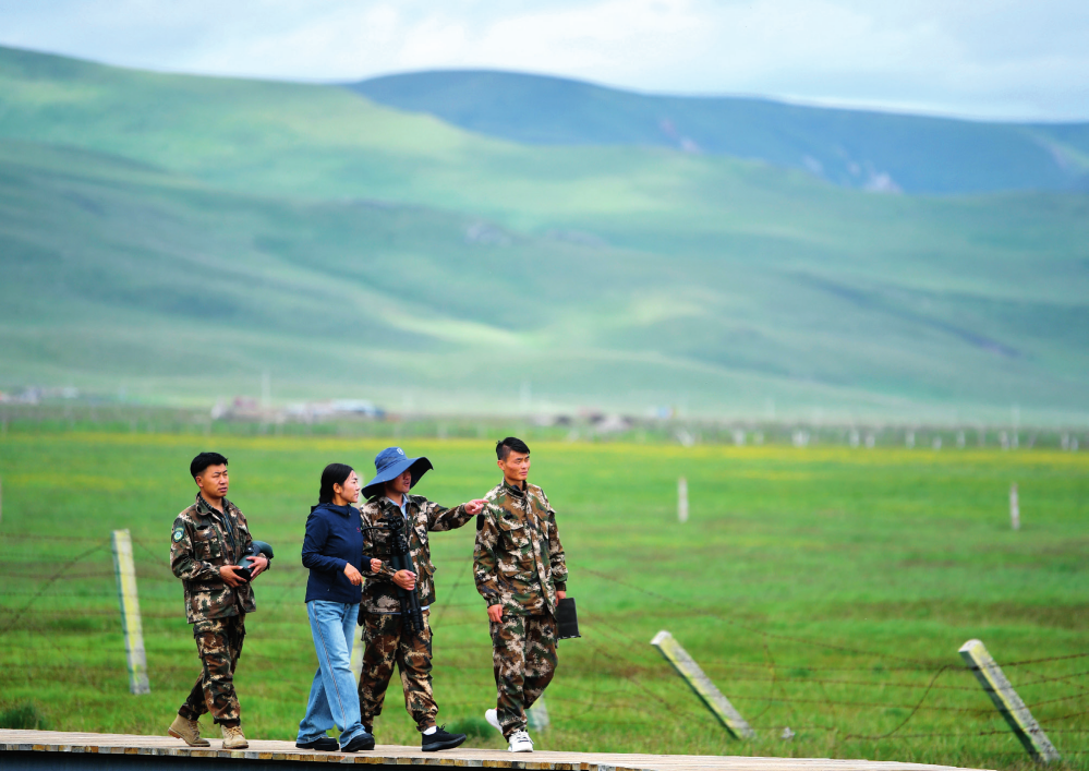 甘肅尕海則岔國家級自然保護(hù)區(qū)管護(hù)中心尕海保護(hù)站站長香毛吉 ( 左二)和同事在保護(hù)區(qū)內(nèi)巡護(hù)(2023 年 7 月 7 日攝)陳斌攝 / 本刊