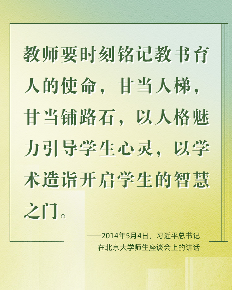 他們帶領(lǐng)學(xué)生前行,更新舊知、開掘新知、探索未知;他們肩負(fù)光榮使命,為黨育人、為國(guó)育才、為民育未來。守教育報(bào)國(guó)初心、擔(dān)立德樹人使命、圓民族復(fù)興之夢(mèng),建設(shè)社會(huì)主義現(xiàn)代化強(qiáng)國(guó)之路上,教育家精神自當(dāng)念茲在茲、代代傳承、光芒永綻。