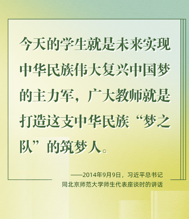 教師是立教之本、興教之源。2024年9月10日,是我國(guó)第40個(gè)教師節(jié)。黨的十八大以來,習(xí)近平總書記始終高度重視教師隊(duì)伍建設(shè),立足實(shí)現(xiàn)中華民族偉大復(fù)興中國(guó)夢(mèng)、打造中華民族“夢(mèng)之隊(duì)”筑夢(mèng)人的特殊歷史使命,對(duì)教師相繼提出了“四有好老師”“四個(gè)引路人”“四個(gè)相統(tǒng)一”“大先生”等殷切期望和明確要求。