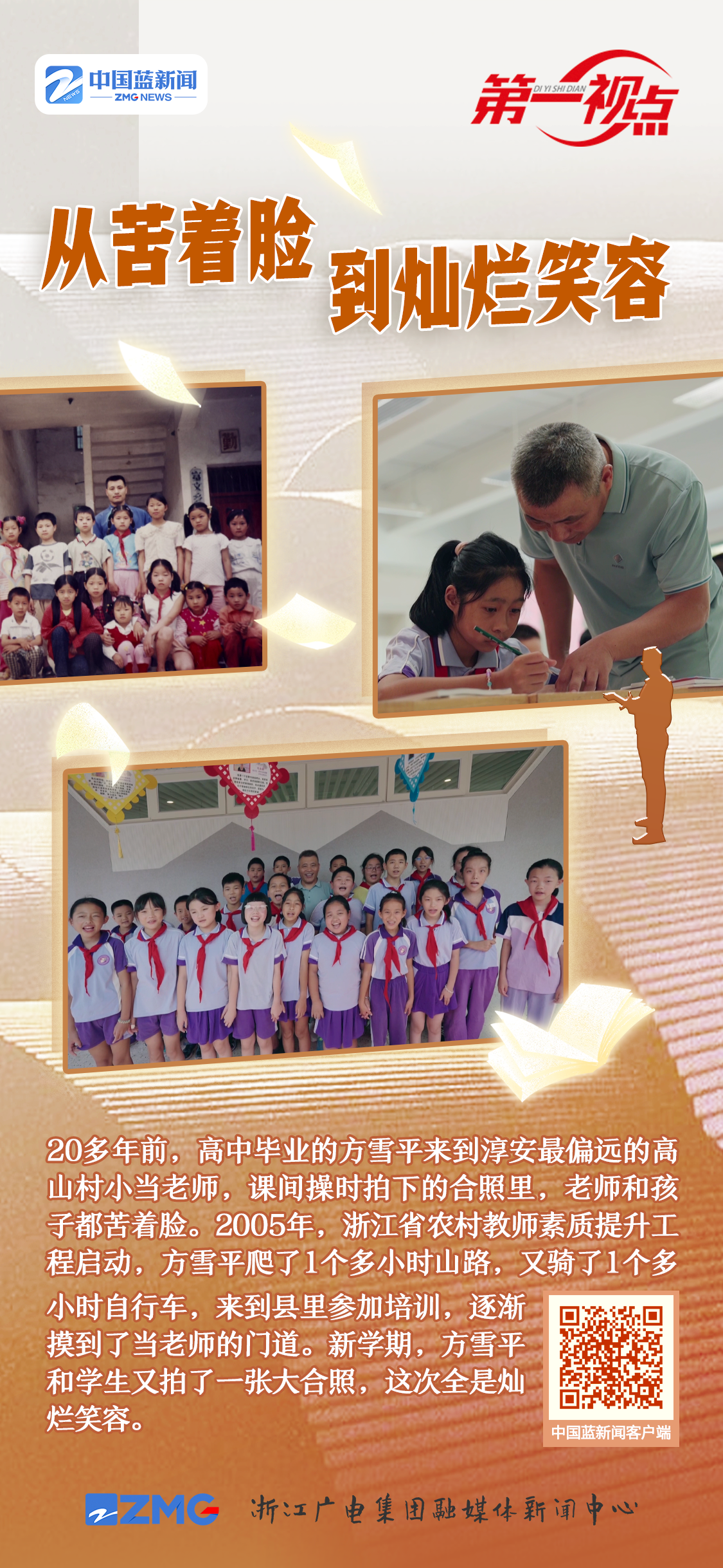 彼時(shí)的浙江,小學(xué)教師的學(xué)歷達(dá)標(biāo)率,在全國(guó)排位倒數(shù)。高中畢業(yè)的農(nóng)村老師方雪平,來(lái)到淳安最偏遠(yuǎn)的高山村小。一個(gè)人,要教兩個(gè)年級(jí)20多個(gè)孩子的全部科目。一次課間操時(shí),村小老師拍下的照片,無(wú)論是老師還是孩子,一個(gè)個(gè)都苦著臉。方雪平說(shuō):“當(dāng)時(shí)(上課時(shí))我心里是很緊張的,緊張到手心冒汗。外出培訓(xùn)的機(jī)會(huì)幾乎是沒(méi)有的,自己慢慢去摸索唄?!?/p>