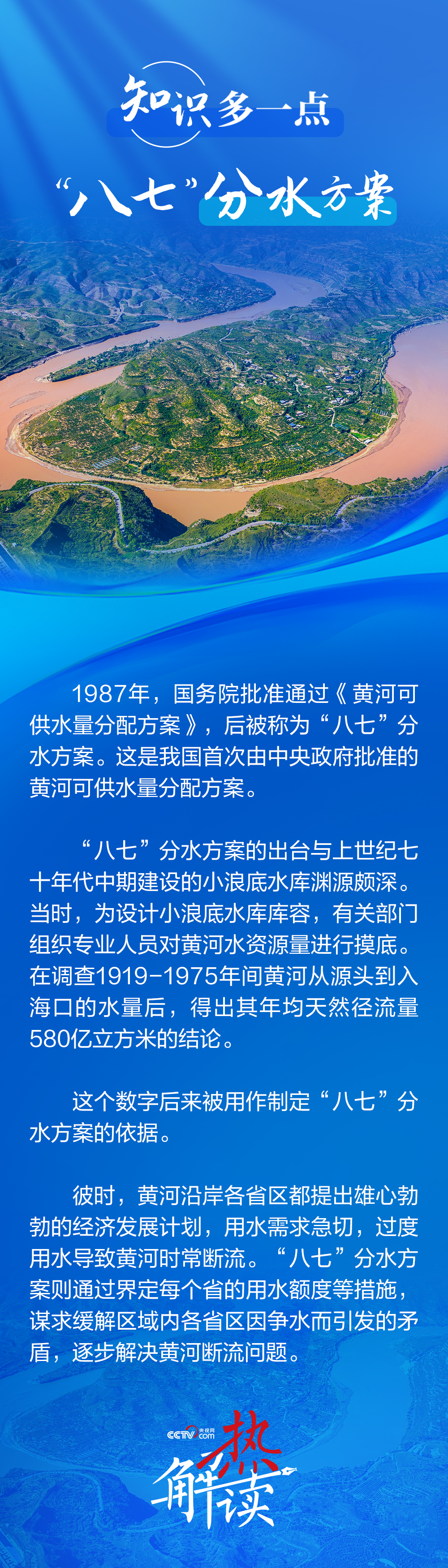 “八七”分水方案是上世紀(jì)八十年代我國(guó)批準(zhǔn)的黃河可供水量分配方案。該方案以1980年實(shí)際用水量為基準(zhǔn),綜合考慮了沿黃各省區(qū)的灌溉發(fā)展規(guī)模、工業(yè)和城市用水增長(zhǎng)以及大中型水利工程興建等因素,來為沿黃各省區(qū)分配黃河用水權(quán)?!鞍似摺狈炙桨缸?987年國(guó)務(wù)院批復(fù)后沿用至今,未重新調(diào)整。