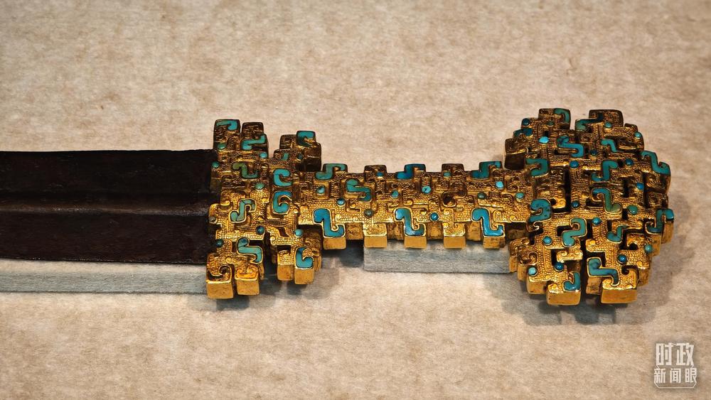 △這是1992年寶雞市益門(mén)二號(hào)墓出土的金柄鐵劍,劍柄嵌有綠松石。(總臺(tái)央視記者彭漢明拍攝)