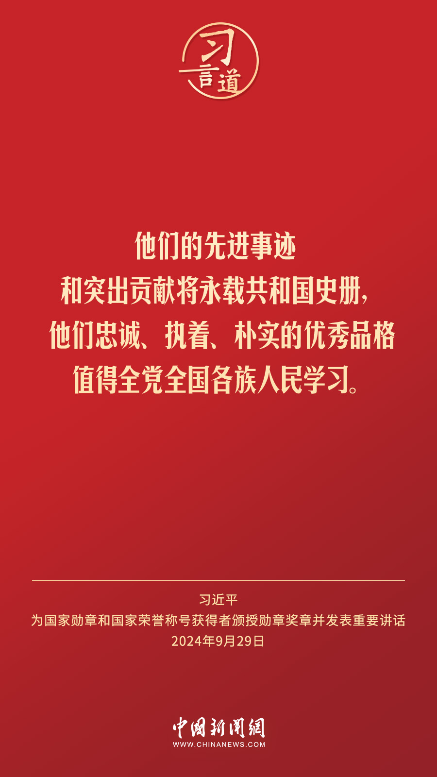 經(jīng)中共中央批準,中華人民共和國國家勛章和國家榮譽稱號頒授儀式于9月29日上午10時在人民大會堂隆重舉行。中共中央總書記、國家主席、中央軍委主席習近平向國家勛章和國家榮譽稱號獲得者分別授予“共和國勛章”“友誼勛章”和國家榮譽稱號獎章并發(fā)表重要講話。習近平指出——