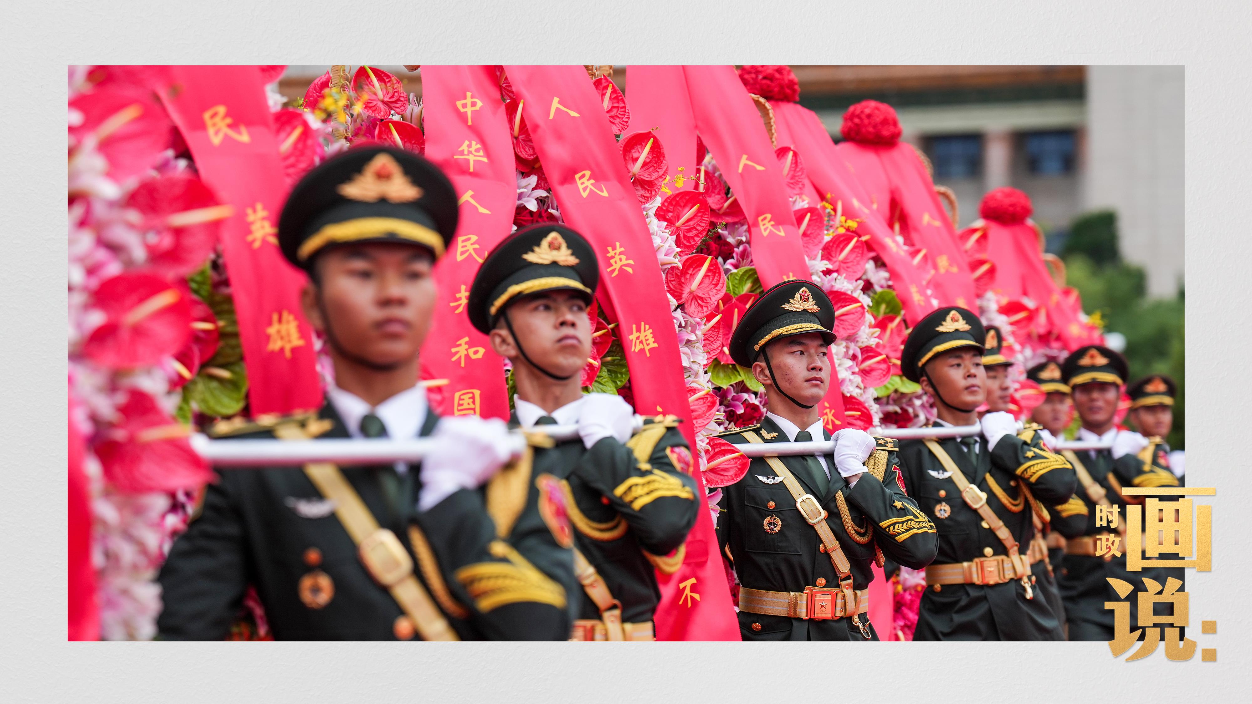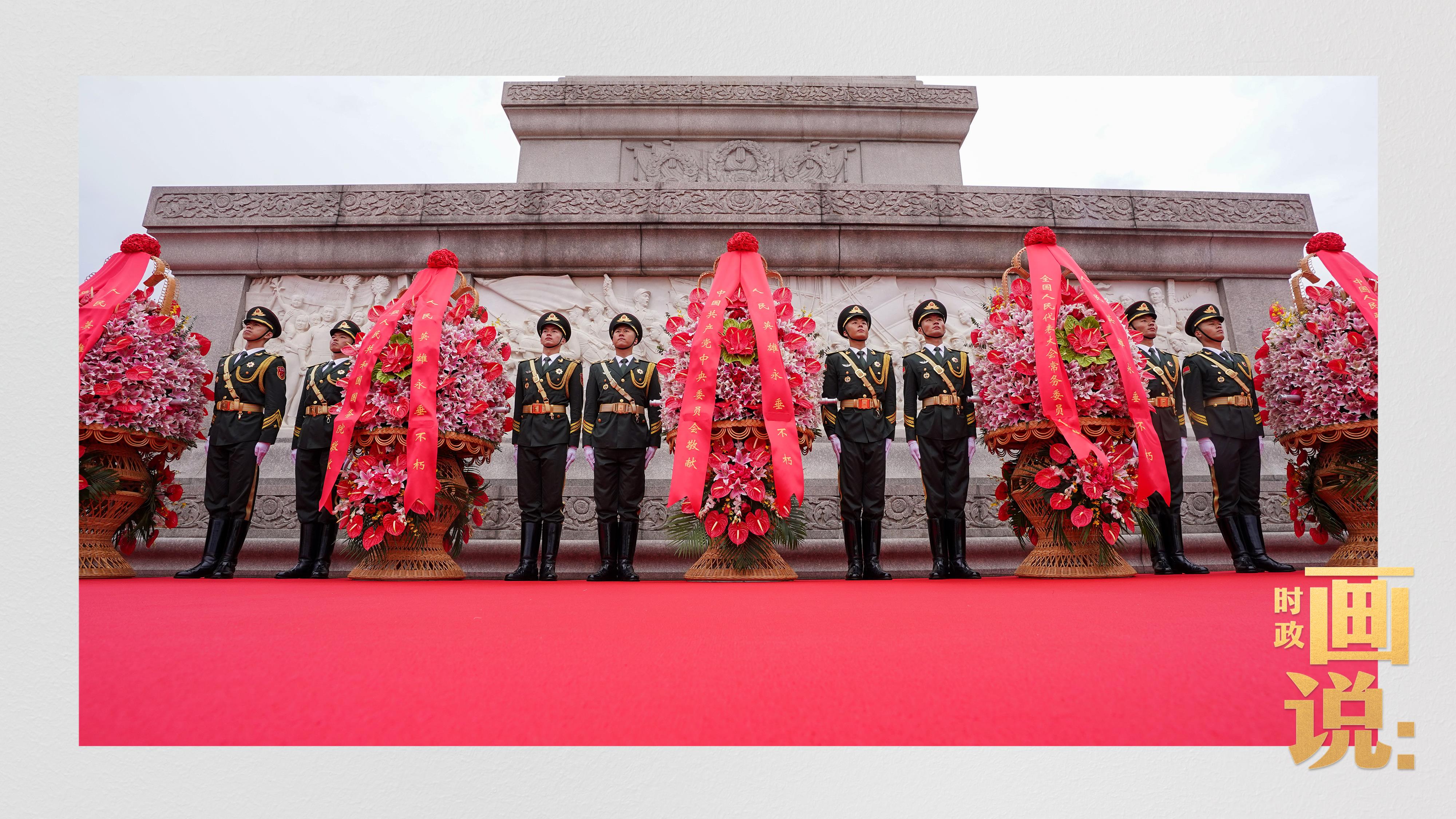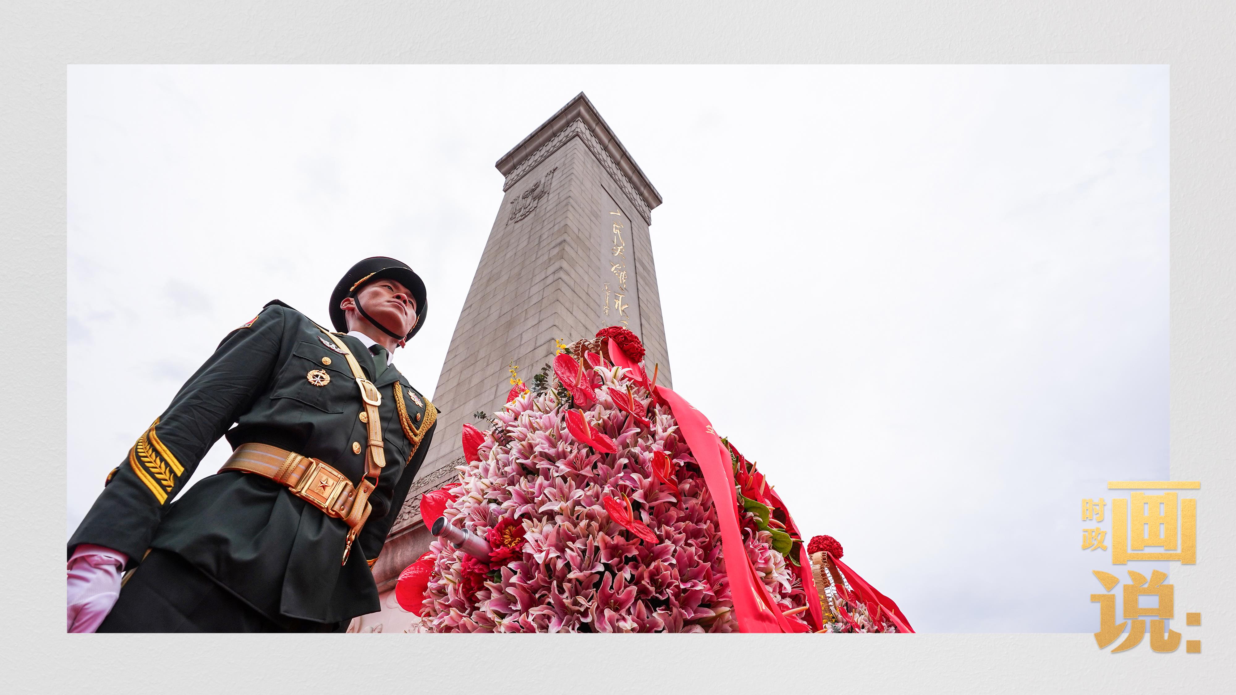 禮兵抬起花籃,緩步走向人民英雄紀念碑。