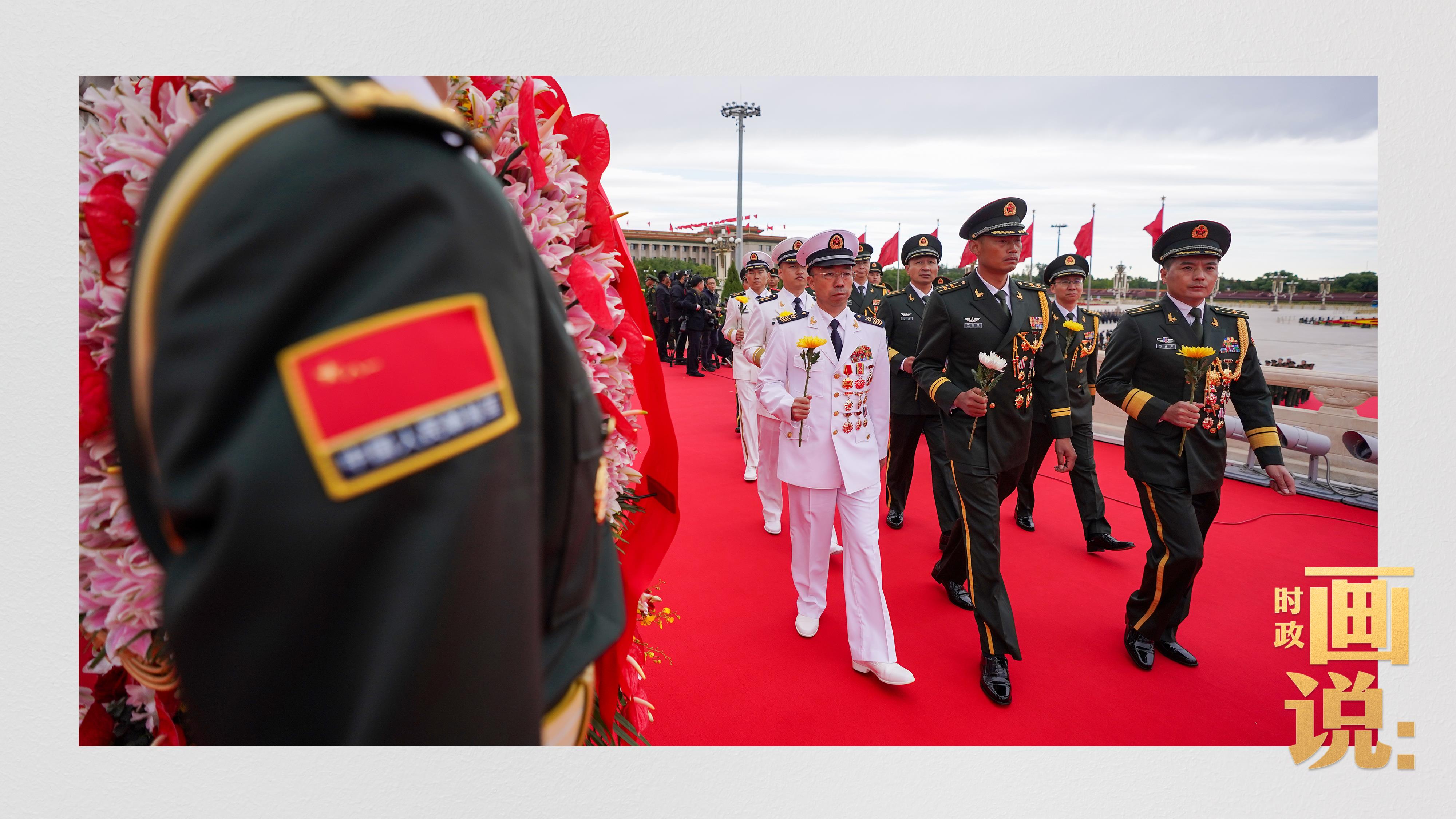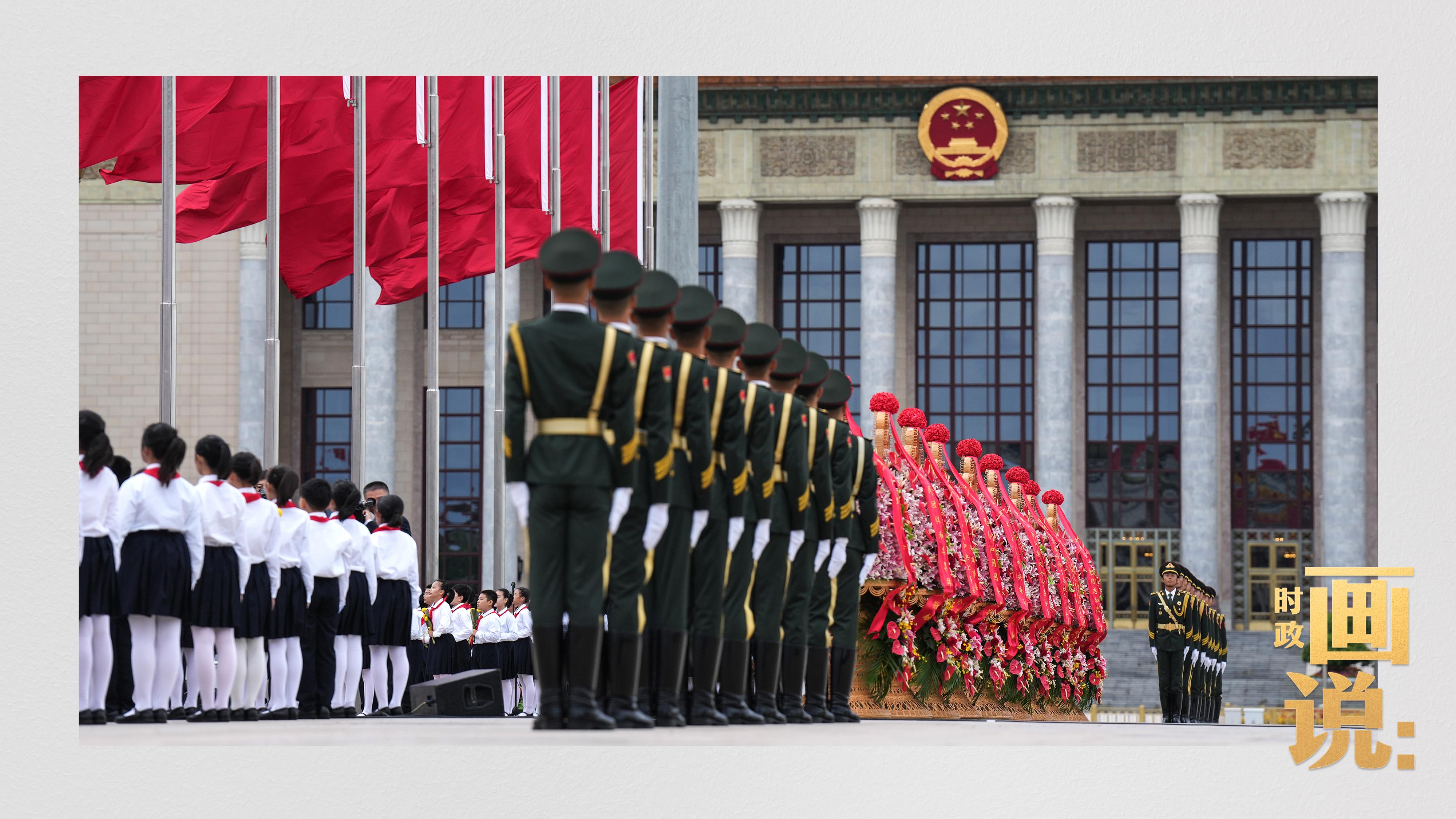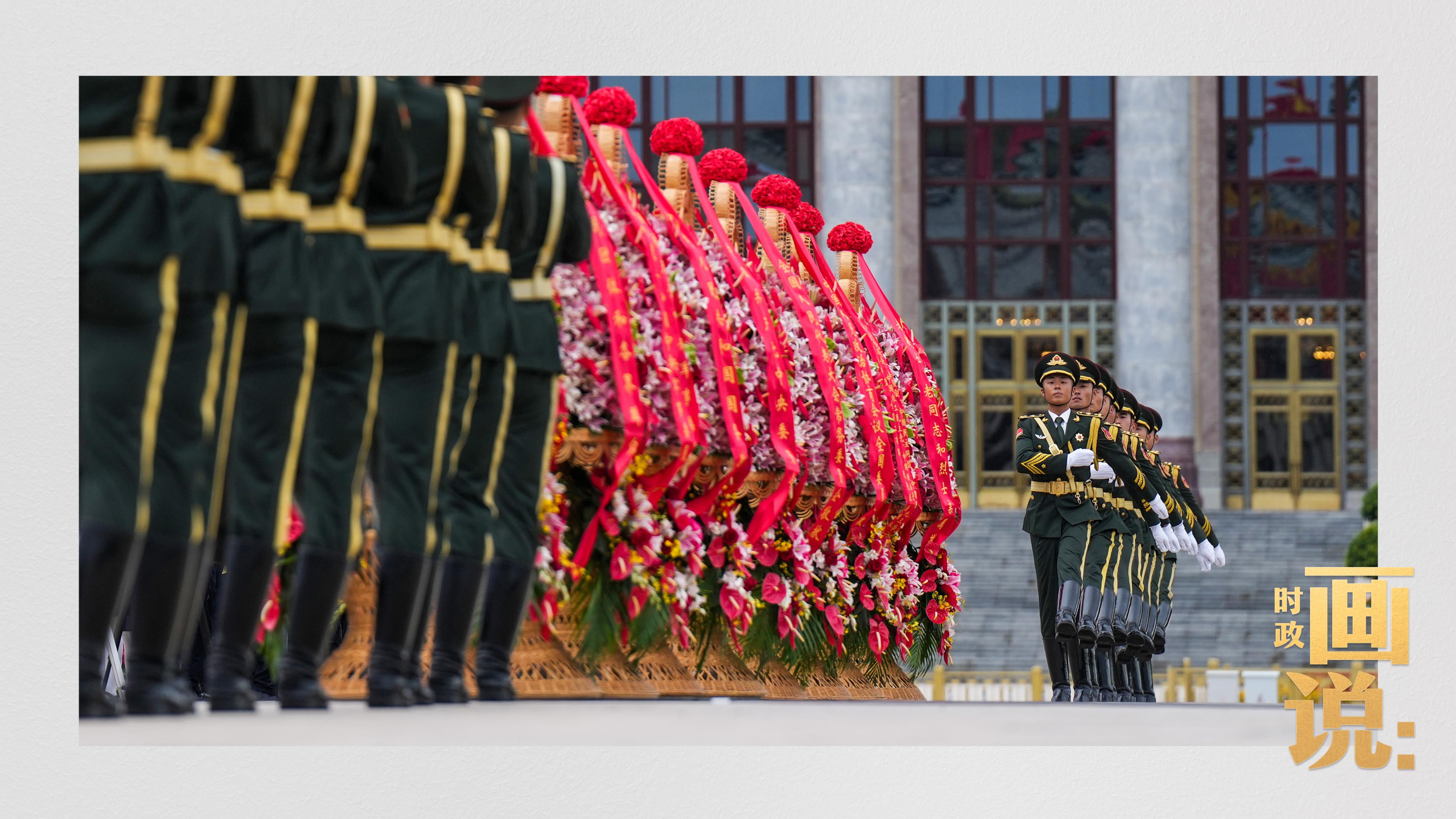 禮兵抬起花籃,緩步走向人民英雄紀念碑。
