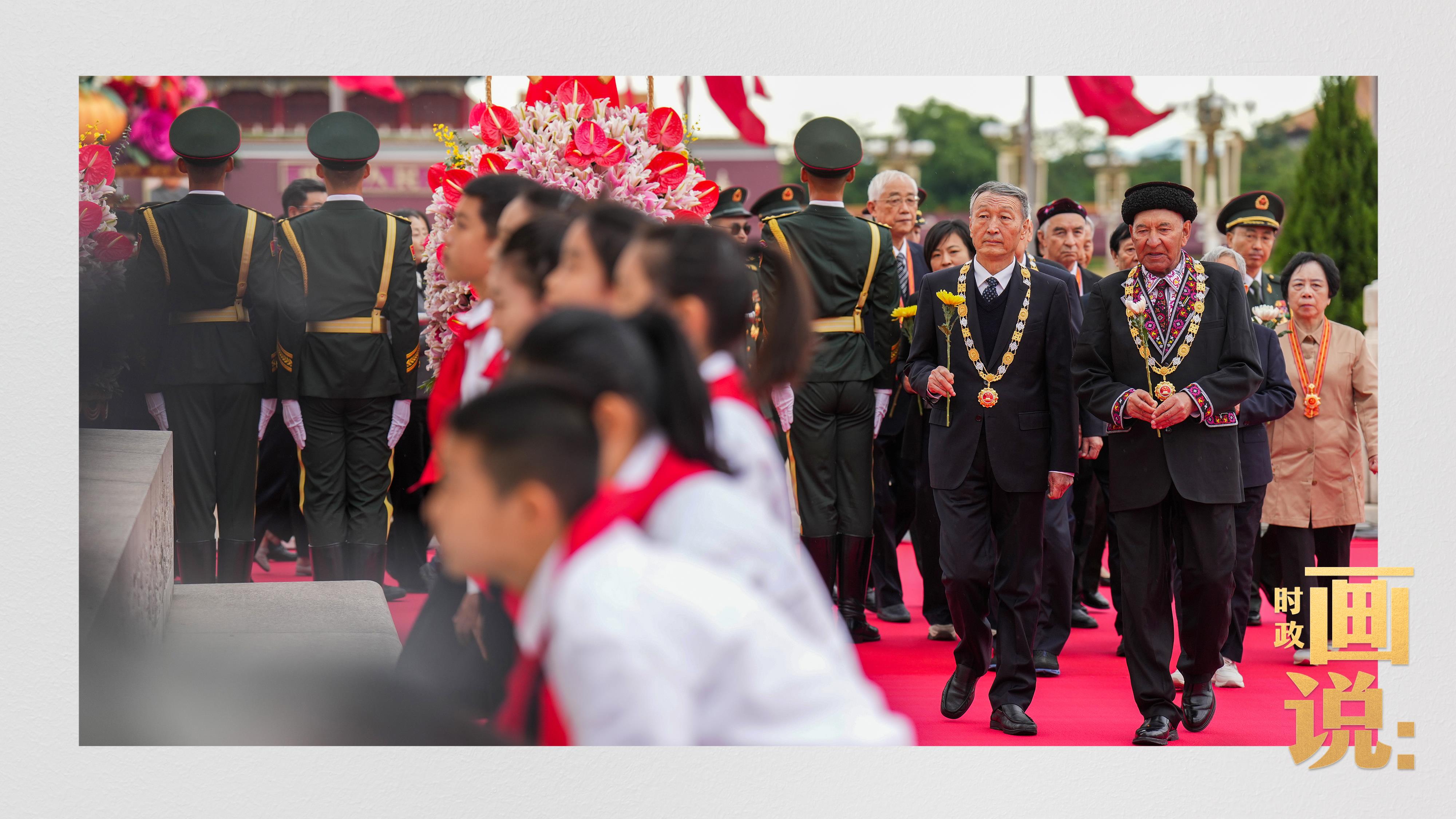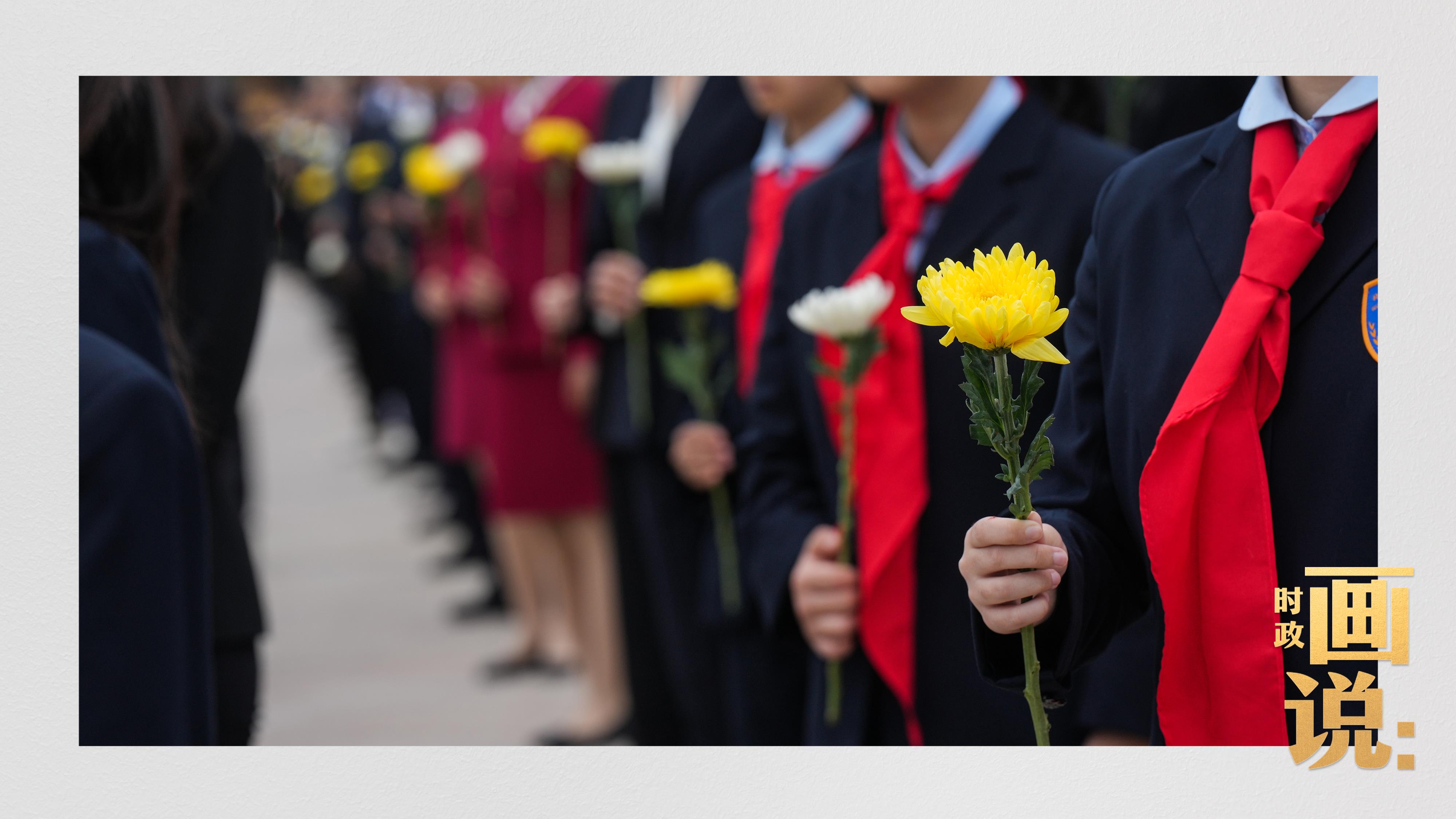少年兒童和各界代表依次走到紀念碑前,獻上手中鮮花并瞻仰紀念碑。