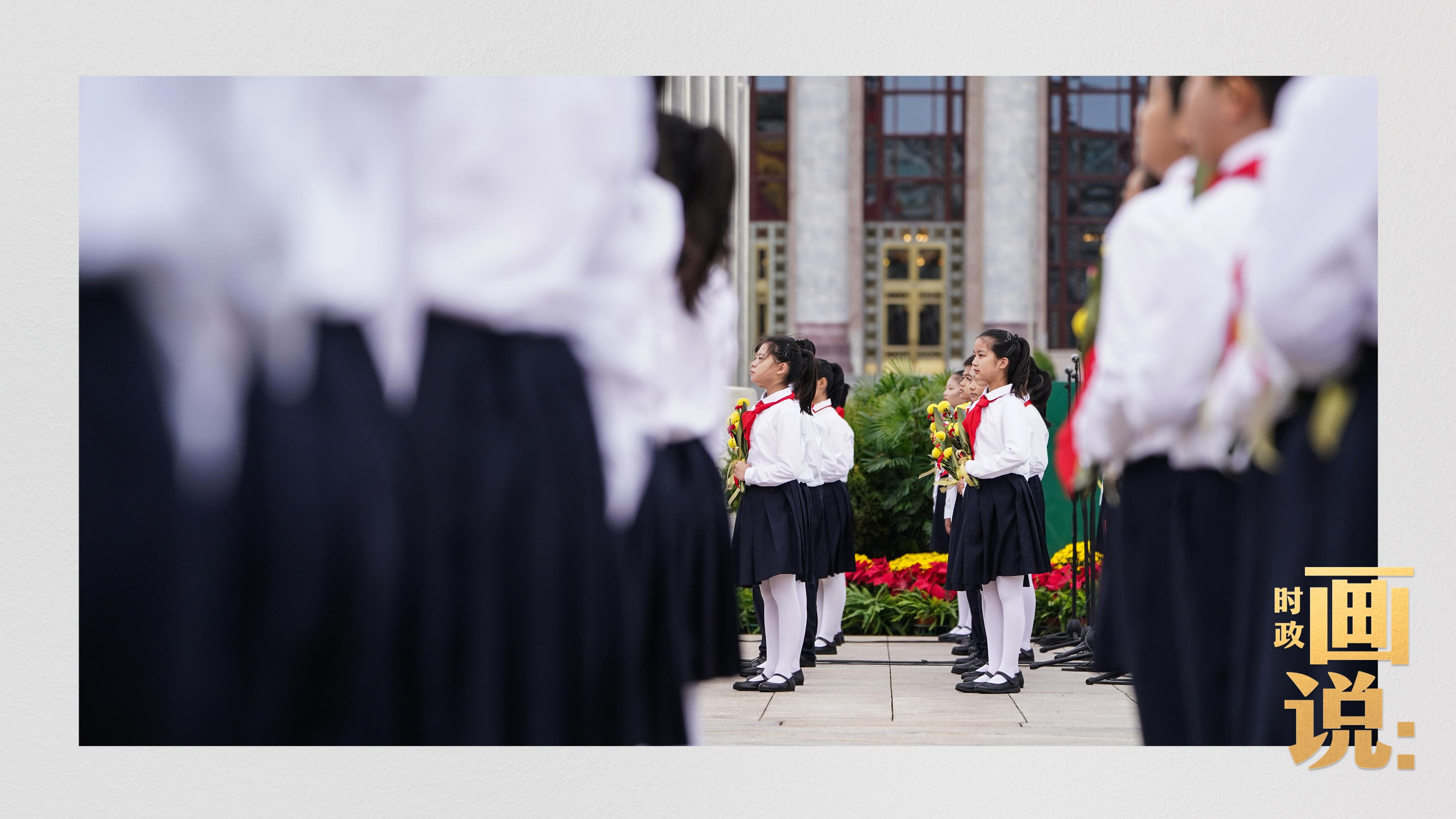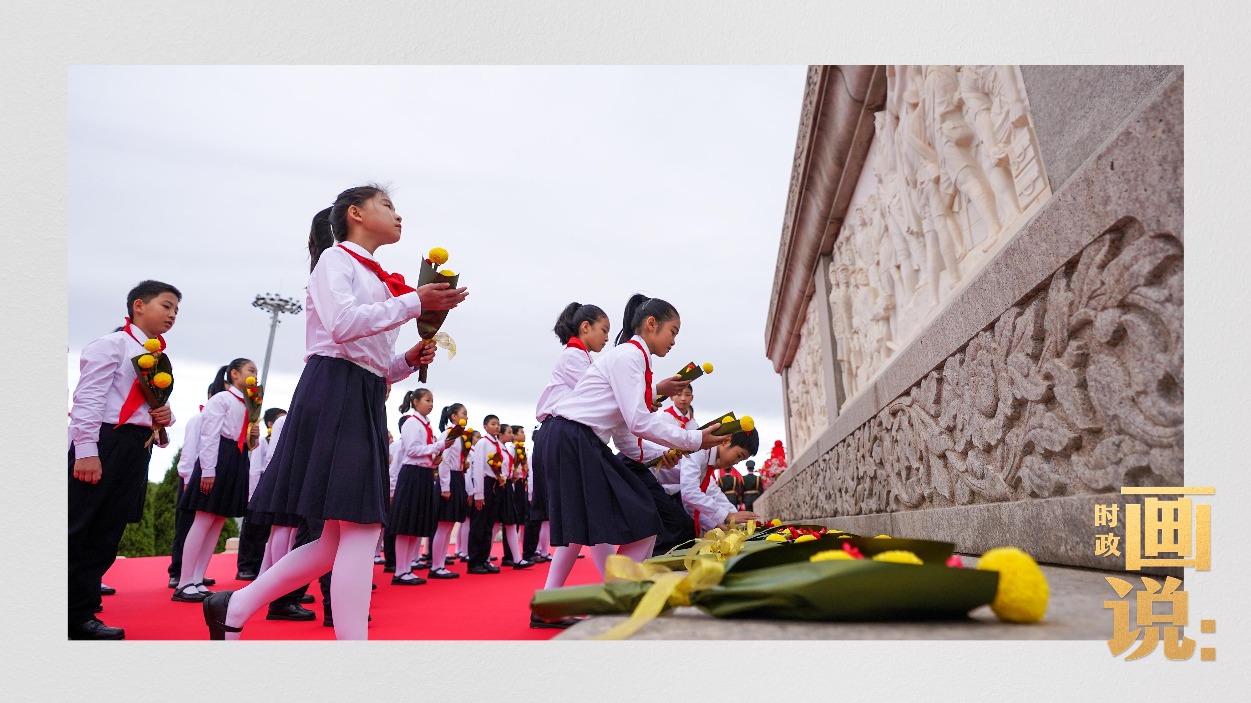 手持鮮花的少年兒童面向人民英雄紀念碑高唱《我們是共產主義接班人》。