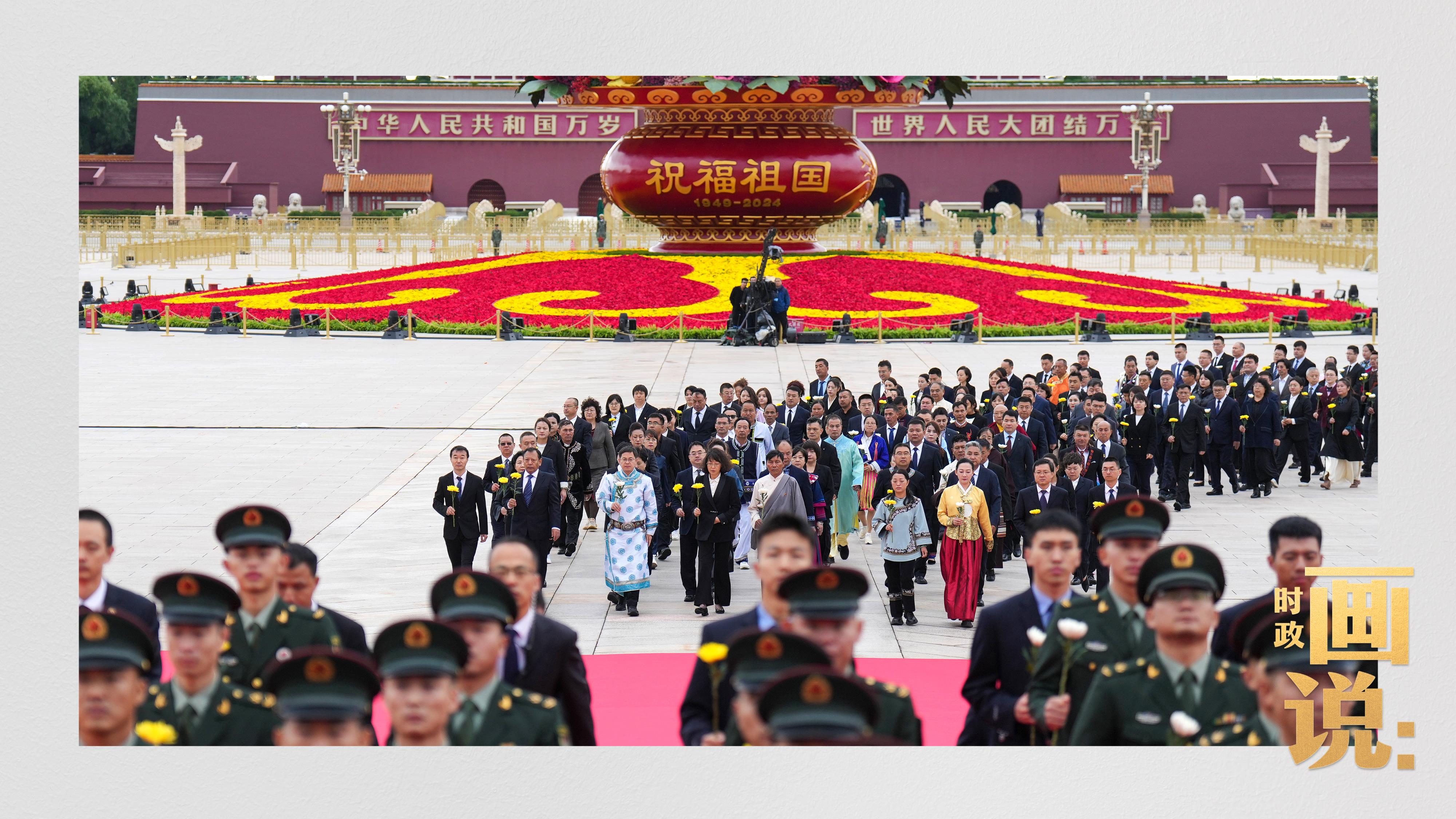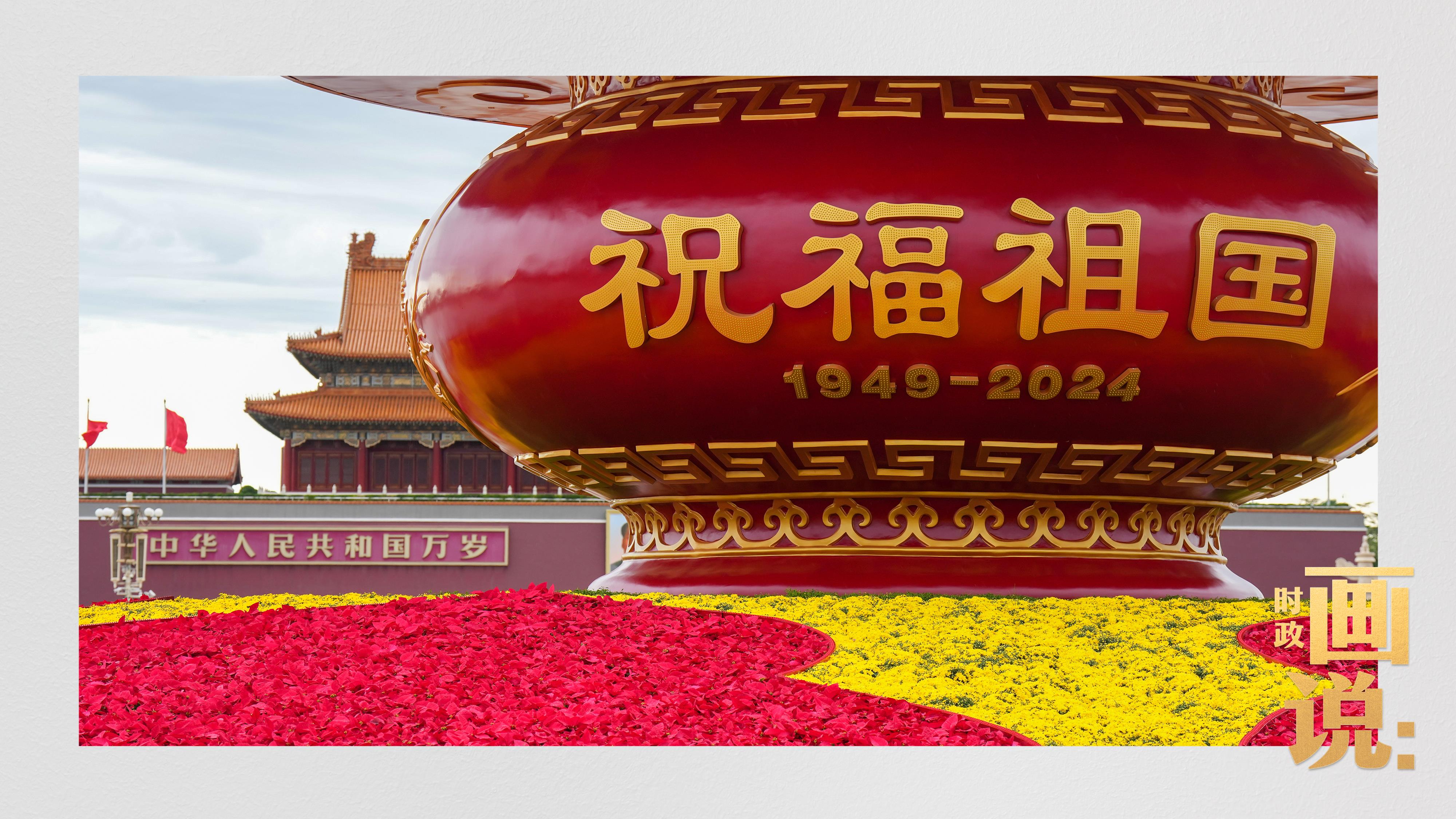 天安門廣場中央,“祝福祖國”巨型花籃表達著對國家繁榮富強的美好祝福。