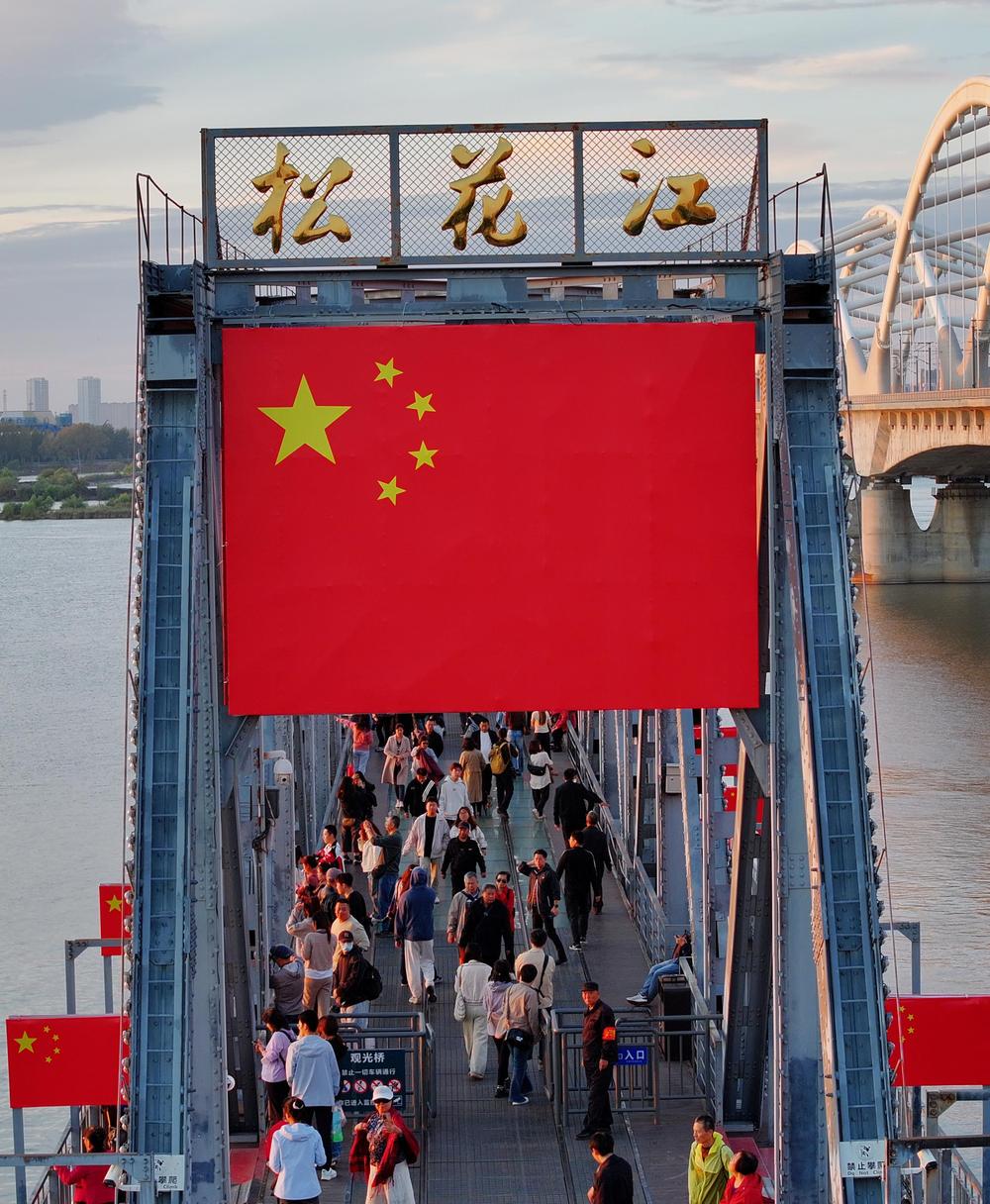 △2024年9月23日,黑龍江省哈爾濱市松花江濱洲鐵路橋披上百面國(guó)旗,慶祝新中國(guó)成立75周年。