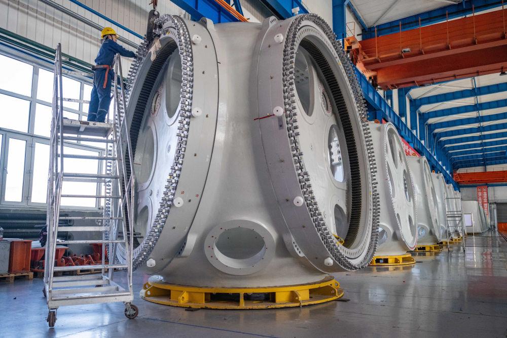2024年4月28日,工作人員在中國一重集團有限公司的風電設備裝配車間內(nèi)加工風電輪轂。