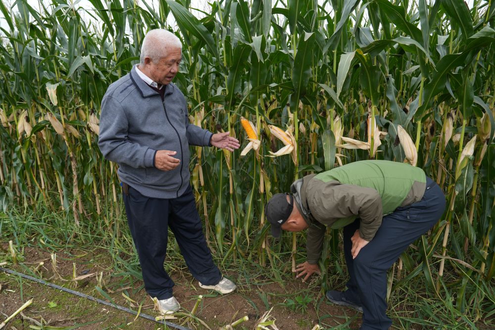楊生明(左)和農(nóng)戶探討玉米種植技術(shù)。新華社記者 唐紫宸 攝