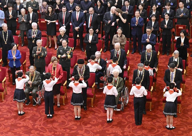 2024年9月29日,少先隊(duì)員向國(guó)家勛章和國(guó)家榮譽(yù)稱號(hào)獲得者敬禮致意。