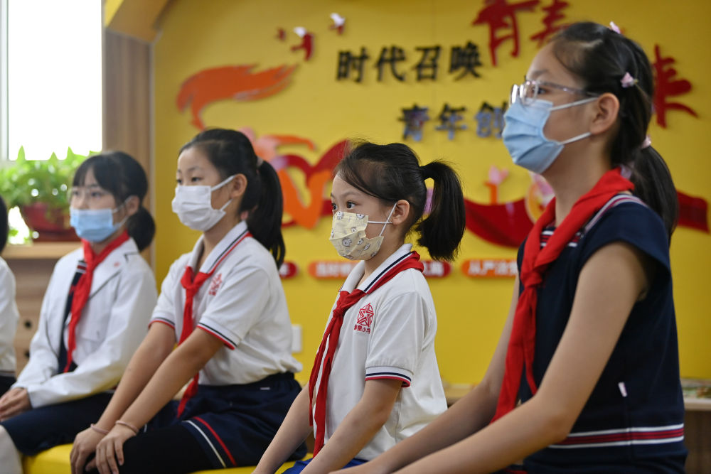 天津市和平區(qū)新星小學(xué)學(xué)生在觀(guān)看電影《我和我的祖國(guó)》(2021年9月28日攝)。