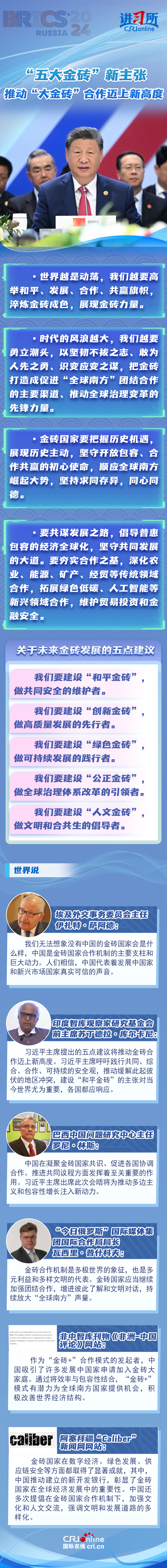 “時(shí)代的風(fēng)浪越大,我們?cè)揭铝⒊鳖^,以堅(jiān)韌不拔之志、敢為人先之勇、識(shí)變應(yīng)變之謀,把金磚打造成促進(jìn)‘全球南方’團(tuán)結(jié)合作的主要渠道、推動(dòng)全球治理變革的先鋒力量?!碑?dāng)?shù)貢r(shí)間10月23日,習(xí)近平主席在俄羅斯喀山出席金磚國(guó)家領(lǐng)導(dǎo)人第十六次會(huì)晤并發(fā)表重要講話(huà),提出共建“和平金磚”“創(chuàng)新金磚”“綠色金磚”“公正金磚”“人文金磚”,為“大金磚合作”擘畫(huà)藍(lán)圖。