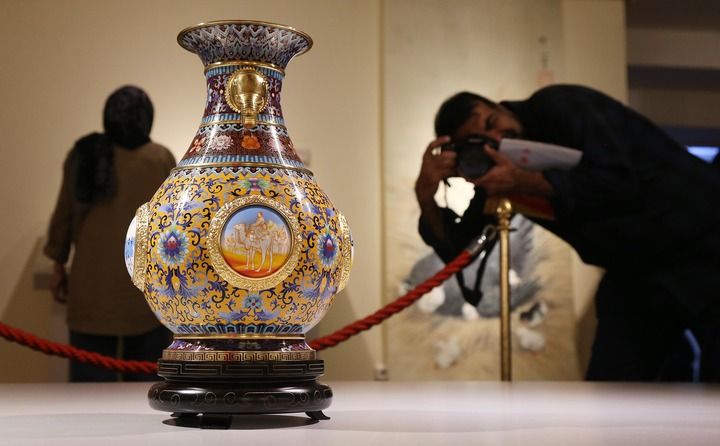 2024年10月12日,在伊朗首都德黑蘭的馬利克國(guó)家博物館,觀(guān)眾在“絲路長(zhǎng)云——中國(guó)藝術(shù)文化精品展”現(xiàn)場(chǎng)拍攝展品。新華社記者 沙達(dá)提 攝