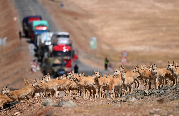 2023年5月29日,當(dāng)?shù)毓芾聿块T工作人員在青藏公路上臨時(shí)截停來往車輛,為一群前往可可西里卓乃湖產(chǎn)仔的藏羚羊讓路。可可西里地處三江源國家公園,是國家一級保護(hù)動(dòng)物藏羚羊重要的棲息地。每年5月至7月,來自青海三江源、新疆阿爾金山、西藏羌塘的雌性藏羚羊會(huì)遷徙到可可西里卓乃湖,待產(chǎn)仔后再攜幼仔返回原棲息地。