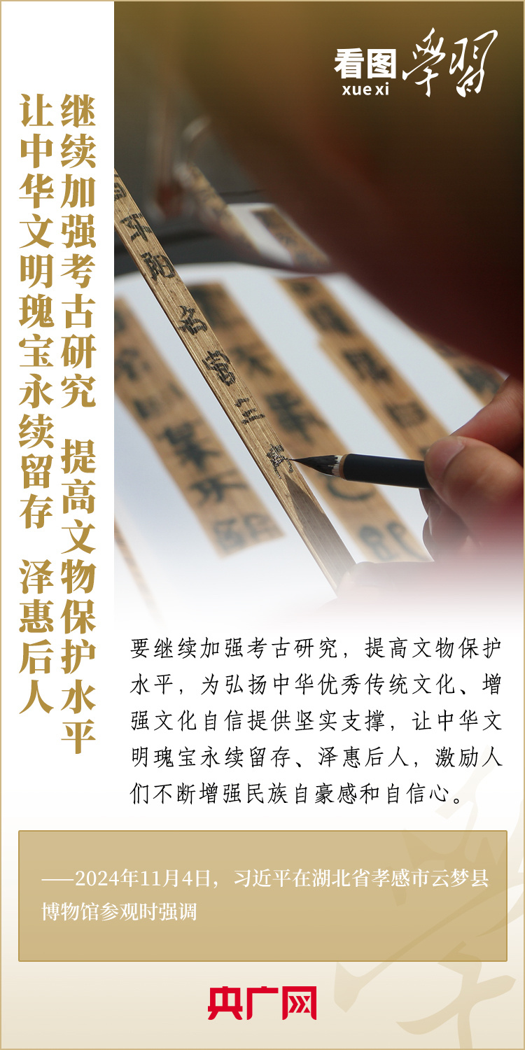 11月4日,習近平總書記在湖北省孝感市云夢縣博物館參觀出土秦漢簡牘展。這里收藏的我國考古史上首次發(fā)現的秦簡——云夢睡虎地秦簡,反映了戰(zhàn)國晚期到秦始皇時期的政治、經濟、文化、法律、軍事等方面的情況。習總書記詳細聽取簡牘內容、歷史文化價值和保護研究情況介紹,指出要繼續(xù)加強考古研究,提高文物保護水平,讓中華文明瑰寶永續(xù)留存、澤惠后人。