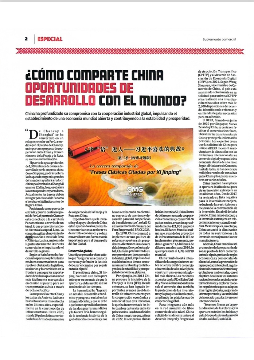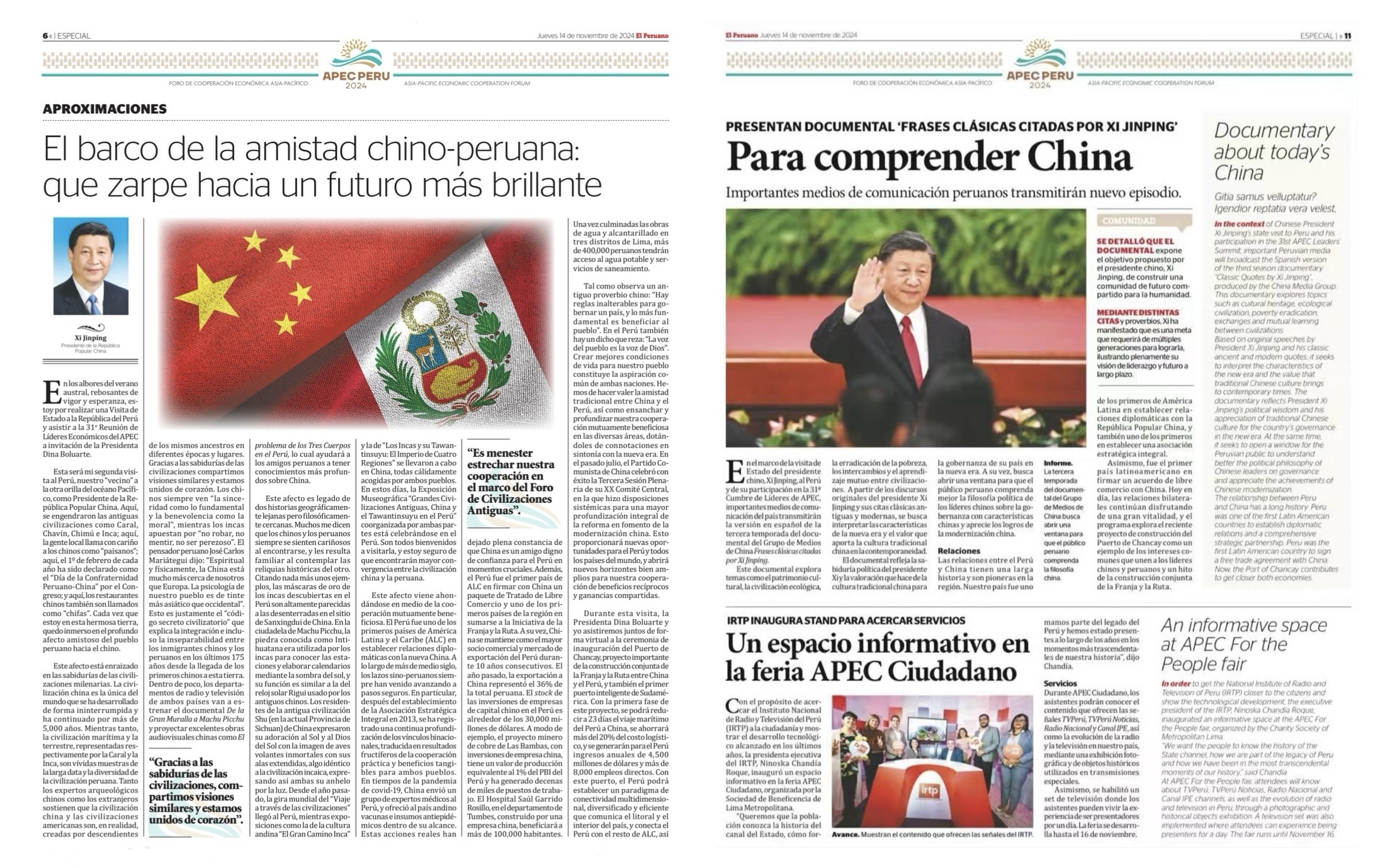 11月14日,秘魯最具影響力的官方報(bào)紙《秘魯人報(bào)》刊發(fā)節(jié)目在秘魯落播的消息。文章指出,《平“語(yǔ)”近人——習(xí)近平喜歡的典故》第三季展現(xiàn)了中華民族開(kāi)放包容、兼收并蓄的文化胸懷,闡釋了習(xí)近平主席提出的推動(dòng)構(gòu)建人類(lèi)命運(yùn)共同體的這一重大理念,是對(duì)“建設(shè)一個(gè)什么樣的世界、怎樣建設(shè)這個(gè)世界”給出的中國(guó)方案?!睹佤斎藞?bào)》特刊整版刊發(fā)《平“語(yǔ)”近人——習(xí)近平喜歡的典故》第三季(西班牙語(yǔ)版)將在秘魯主流媒體落播特稿?!睹佤斎藞?bào)》官網(wǎng)也同步刊發(fā)了節(jié)目預(yù)告消息和海報(bào)。
