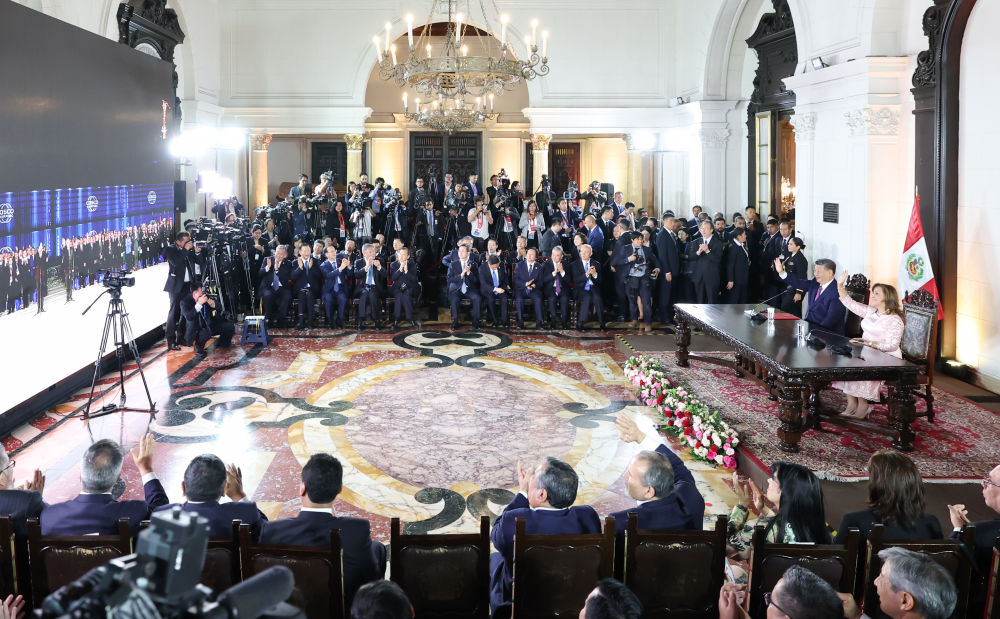 當(dāng)?shù)貢r(shí)間11月14日晚7時(shí)許,秘魯首都利馬總統(tǒng)府一層埃萊斯普魯廳,燈火通明,氣氛熱烈。習(xí)近平主席同秘魯總統(tǒng)博魯阿爾特以視頻方式共同出席秘魯錢(qián)凱港開(kāi)港儀式。