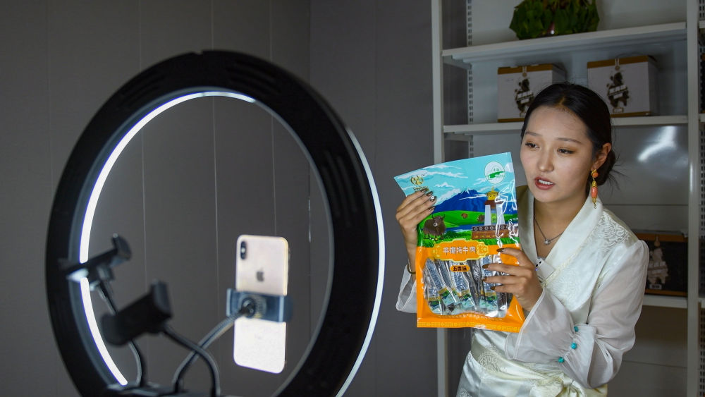 9月24日,果洛藏貢麻村村民多杰吉在進行網(wǎng)絡(luò)帶貨直播。(潘彬彬 攝)